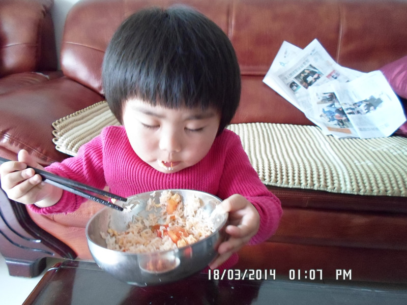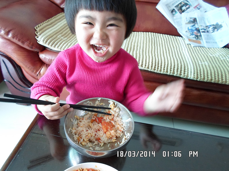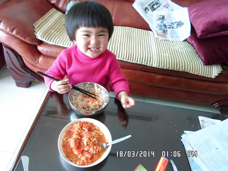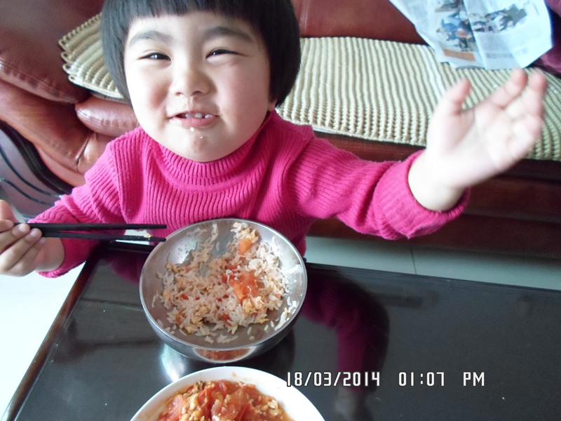 莹莹也是特别的爱吃西红柿炒菜了,她把西红柿炒蛋放在饭上面搅一下,就会吃得特别的香,看她的表情就知道有多好吃呢。