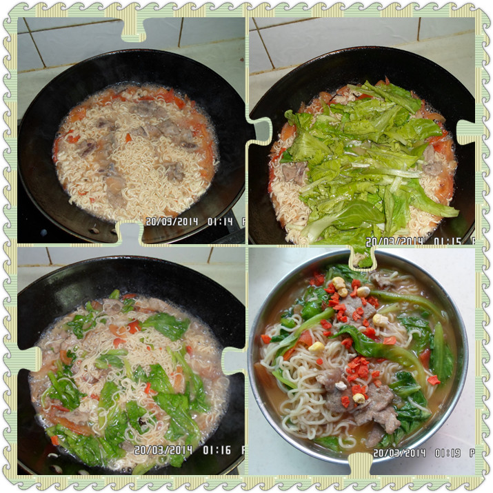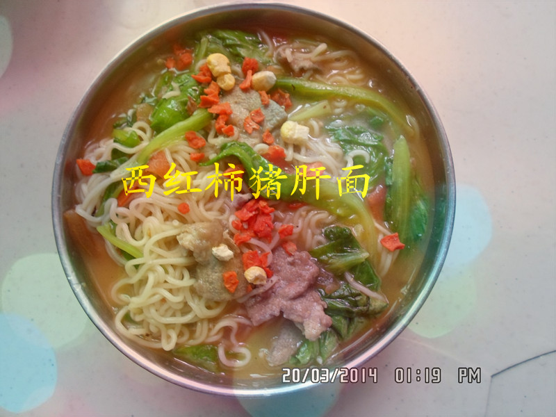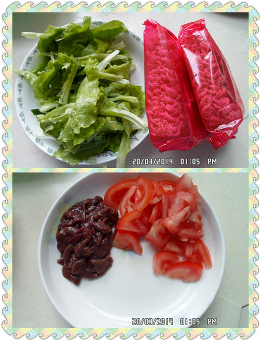 西红柿猪肝面:原料如下:西红柿、猪肝、泡面、生菜、姜丝水、葱头