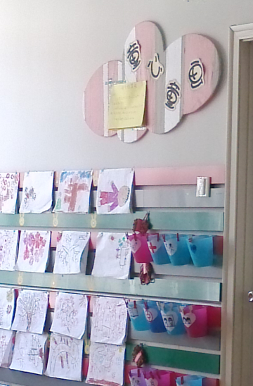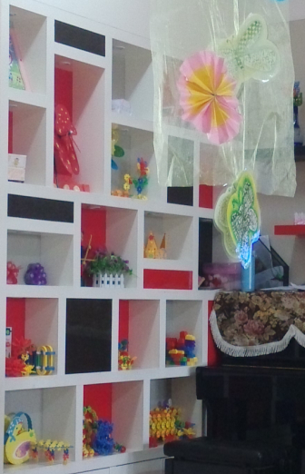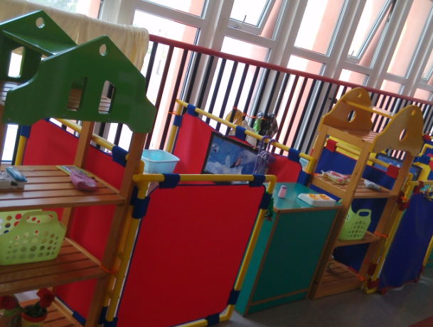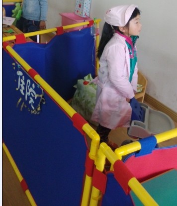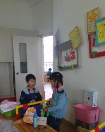 我们主要参观了幼儿园中班的教室内外,这些环境的布置也花了老师不少的心血呢,在我们进入教室之前我们看到了一个个栅栏围起来的地方,我问点点这是干什么的,点点说这是小朋友们玩娃娃家游戏的,还有一些超市,银行,还有理发店,医院等等。