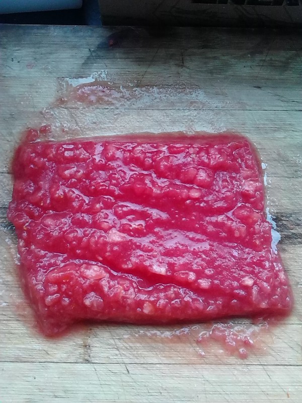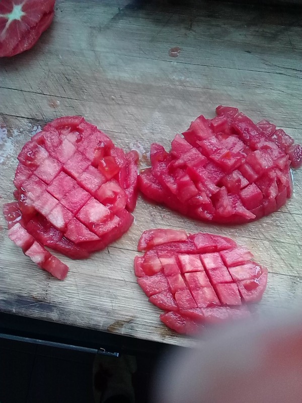 先把西红柿洗净去皮,再切成小块,想办法弄成汁。我是切成小块,再剁碎的,本来想弄成汁,婆婆说这样也行,拌到面粉里一样会吸收的,好吧,听人劝吃饱饭,我也不用太费力了。