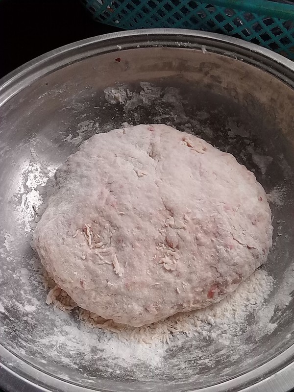 面粉里加白糖和酵母混合均匀,再加入盐混合,然后一点一点的加西红柿汁,调成干湿合适的面团。本来我是准备用面包机弄的,刚好今天妈妈在,嘿嘿,就把妈妈当面包机了,其实就是她帮我搅和啦。看看,最后就是这么大的一个面团。