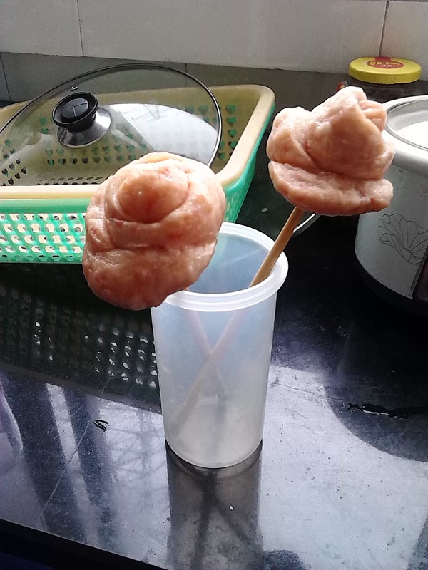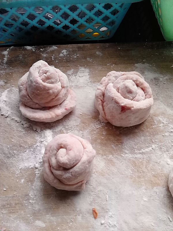 将面团分成小剂子,擀成圆片,从中间切开,将面片缠在筷子上,裹成玫瑰花形状