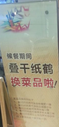 等位期间折千纸鹤送菜品,相对应的分别是折十只送老酸奶,二十只送面筋。。。如果折到五十只还送考羊排。如果人多聚会,大家一起折真还没准能折到五十只呢。不过我因为被小妞粘着,老公又不擅长就作罢了,但同样问他们要了点彩纸,回家给妞折纸玩。这样的营销手段帮客人打发等位的无聊很有趣! 惊喜二: