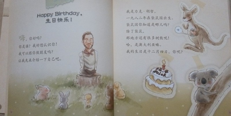 阅读日期:4月15日 参与人员:轩轩和妈妈 阅读绘本:《Happy Birthday,生日快乐!》 绘本特色:有爱的人生是美好的人生 适读年龄: 3岁以上 阅读心得 轩宝对这个故事中的没有四肢的力克主人公有特别浓厚的兴趣,以前宝也偶尔在路边能偶尔看到一些乞讨的残疾人,从最初看到的会有害怕的感觉到后来慢慢地适应,现在甚至会主动从我钱包里拿硬币送给他们。偶尔还会好奇地问我为什么他们会长成这样,这样的人是不是很可怜。宝的这种转变让我感觉很不错。大概也因为他看到过类似的残疾人,所以才会第一次接触这样的绘本就喜欢上了。 这个故事是力克的自我介绍,他出生于1982年,知道袋鼠国吗,而且还是有很多树熊的澳大利亚。他的生日是12月4日,他的出生让爸爸妈妈还有医生护士吓了一跳,因为他是没有四肢的小海豚人,虽然对爸爸妈妈来说这是个晴天霹雳,但他的爸爸妈妈并没有丢弃他,而是为了他付出了许许多多,让他能够非常快乐地成长。因为有了父母无条件的爱,让力克知道有爱的人生有多美好,所以他也要用爱来回应父母。 很感人的故事,父母对孩子的爱是无条件的。故事讲完,宝突然来了一句:妈妈,我爱你。可能他也是感受到了故事情节中爱的氛围吧。原以来这样的故事讲给宝听,他会不感兴趣呢,出乎我的意料听得还很认真。 本作品未经作者许可不得转载,转载请征求作者意见。擅自转载使用,将保留追究其法律责任的权利! 个性签名