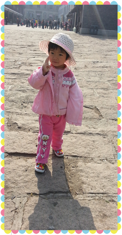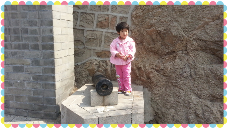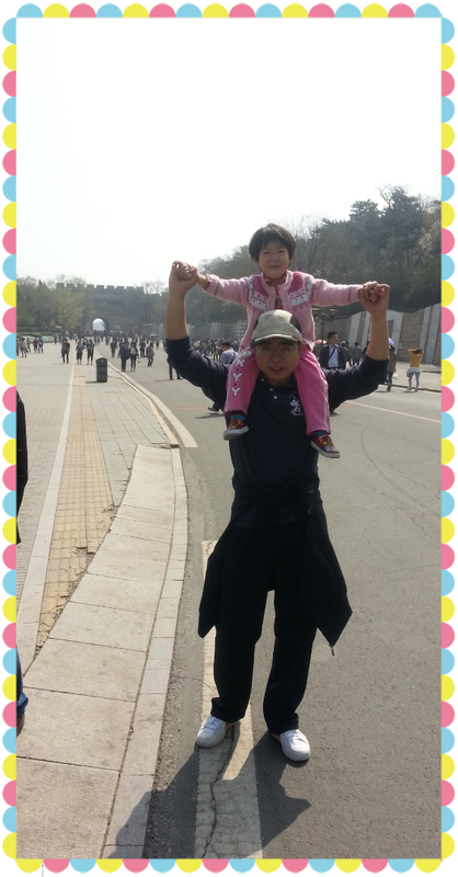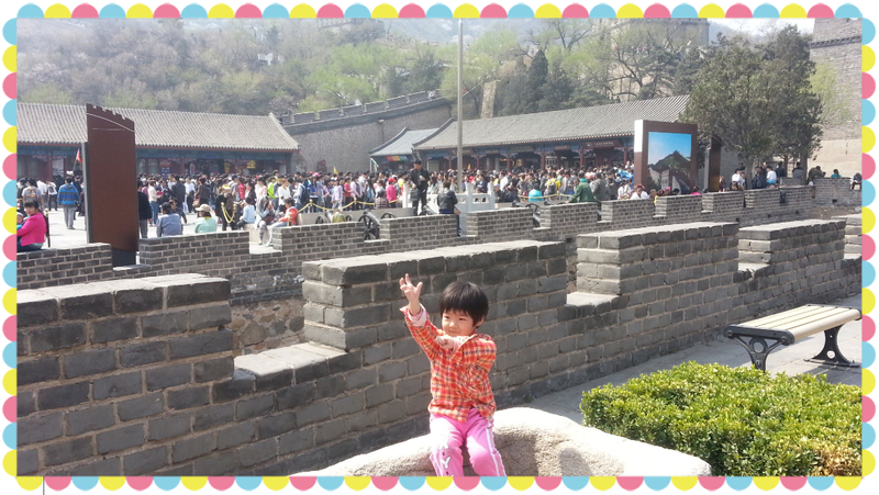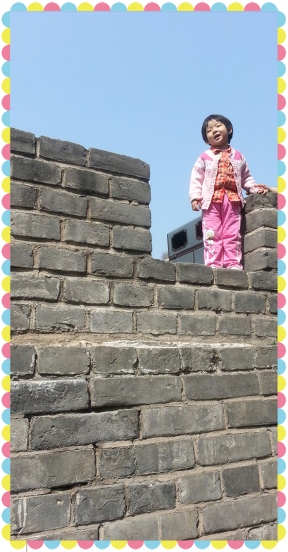 就这样,我和一一从缆车地方下来,把票退了,两路汇合,在城墙上给一一拍照留念。虽然没有登上长城,一一却很兴奋,在城楼上又吃又喝,疯跑,玩的很高兴。