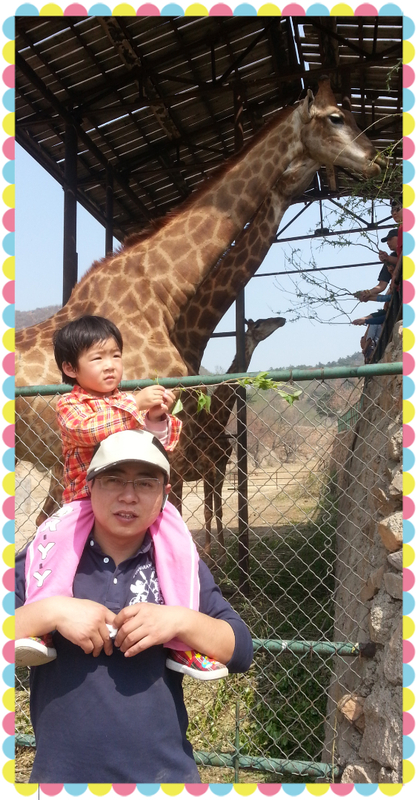 后来进入了温顺动物区,这里面可以下车和动物们玩。我们看到了孔雀,火鸡,珍珠鸡,马,长颈鹿等好多动物。第一次近距离观察长颈鹿。一一从地上捡了个树枝,要喂长颈鹿。可惜长颈鹿没看上,只吃树叶多的树枝。一个树枝就要5块钱呢,真贵啊。
