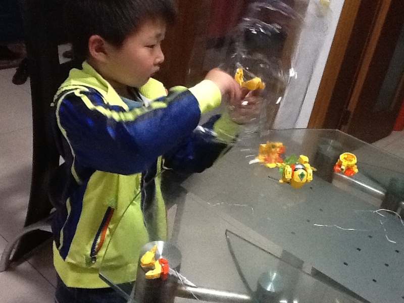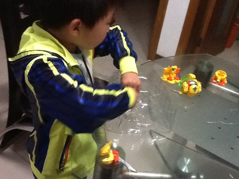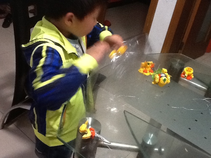 拆开包裹,点点就在桌子上面玩起来了,这个菠萝战宝还是升级了的,里面还有一把钥匙,是用来解锁的,没有升级的时候可以拼成一种样子,升级以后还可以拼成拿着剑的那样,很有意思,就是一个简单的拼装玩具,点点一边玩还会一边说一些我听不懂的话,都是电视里面动画片的对白,我都不记得他是怎么样说的了,反正一个人在那里玩了半小时还意犹未尽。