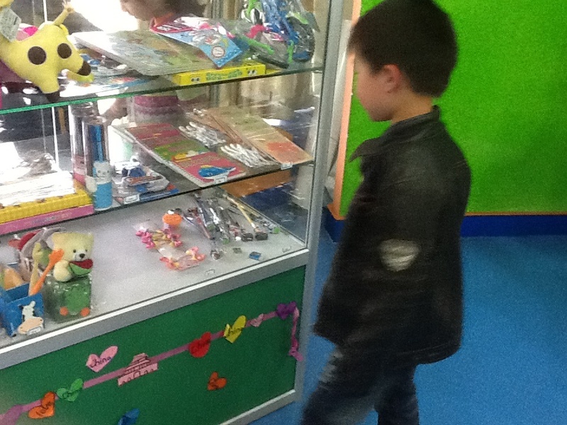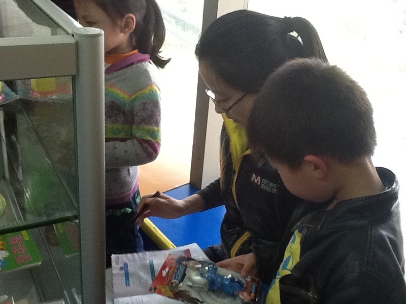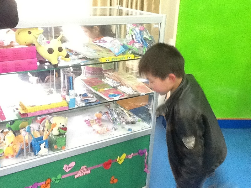 我们学习英语的地方,老师每一节课只要小朋友表现很棒,就可以给小朋友们刻上印章,刻了相应的章就可以换到礼物。这个刻章的方法让孩子们学习英语更有兴趣,为了早日换到自己喜欢的玩具,小朋友们上课都很认真,也从不缺席。我们一开始就看中了一个三百颗印章的画画的蜡笔彩笔套装,所以没有上完课点点就开始数自己的印章有没有得到三百颗了。