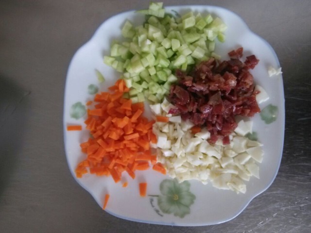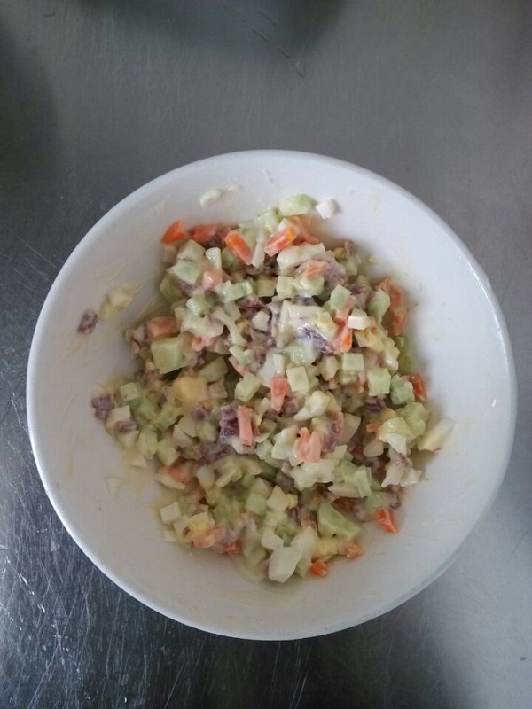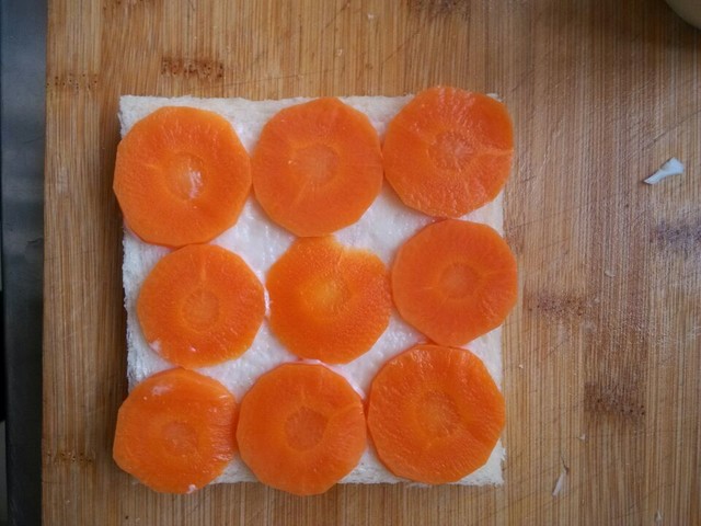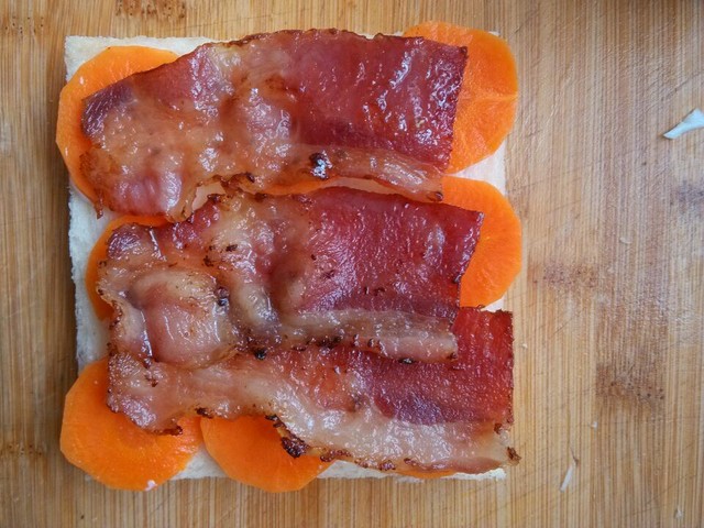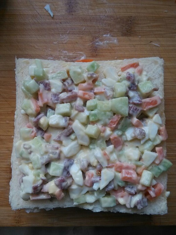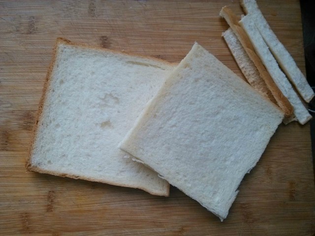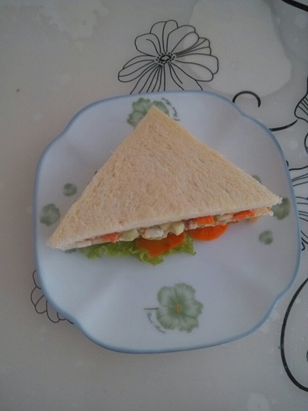 家里不是没有生菜,就是没有火腿,再不就没有面包 当然其实这些都不是理由 主要是我这当妈的懒,哈哈 昨天在家没事,忽然就想起三明治这回事,我问轩,明天早晨想吃什么?他的回答:三明治,好吧,儿子的要求,就是妈妈勤快的动力,哈哈 去超市买了生菜、胡萝卜,面包店买了切片面包,(家里的面包机坏掉了,要不可以自己做面包,估计味道更香),家里还有一根黄瓜,昨晚蒸山药,顺便还煮了2个蛋,培根晚上提前解冻,一切准备就绪 主料:切面面包 生菜2片 胡萝卜半根 黄瓜一根 熟鸡蛋一根 培根3片 配料:沙拉酱 1.先将面包边缘切掉 ![]() 2.胡萝卜切小粒、切片,放入锅中烫熟 ![]() 3.培根放锅中煎一下 ![]() 4.煮熟的鸡蛋,蛋黄蛋黄分离,蛋黄待用 ![]() 5.蛋清切随,黄瓜切小粒 培根切小粒 ![]() 6.准备好沙拉酱,大约2勺的量 ![]() 7.将上述材料搅拌均匀 ![]() 8.取面包一片,涂抹沙拉酱 ![]() 铺上胡萝卜,也可以是生菜 ![]() 铺上煎好的培根 ![]() 放上一片面包,然后把搅拌好的沙拉酱涂好 ![]() 取一片面包,涂好自制的草莓酱,然后覆盖到上面 ![]() 对角线切开即可 ![]() 一顿美味的早晨就搞定啦~~搭配豆浆,营养又美味,hoho ![]() 味道好极了,儿子一阵功夫就解决了两大块,嘿嘿,看来没有不喜欢吃饭的孩子,只有不勤快的妈啊~~