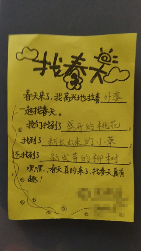 最后我们观察完周围的春天的景色,回到家就要做记录了,在记录的时候,妈妈书写,点点说出自己看到的景象,点点说,春天来了,我高兴的拉着外婆的手一起去找春天,我们找到了盛开的桃花,找到了新长出来的小草,还找到了发芽的柳树,嘿嘿,春天来了,找春天真有趣。