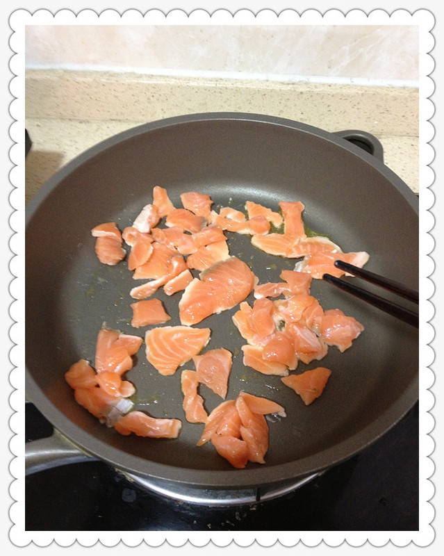 平底锅烧热放点黄油,黄油低温加热即可很快溶解,不需要很大火,待油烧到七成热就可以放入三文鱼粒,用筷子