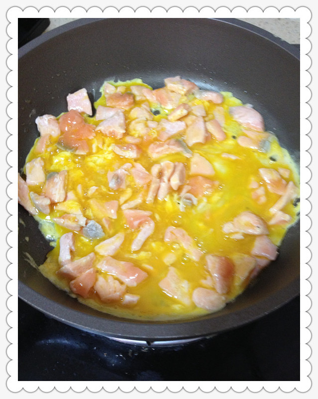 打散,三文鱼很容易熟,接着放点盐把鸡蛋打散,倒进平底锅翻炒即可。