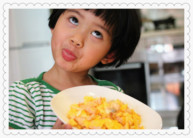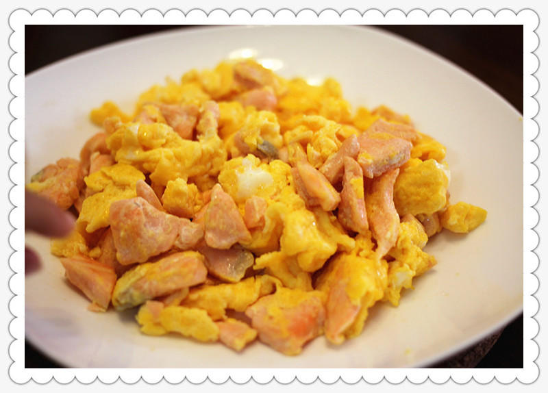 ) ! 想起冰箱有三文鱼,那就做个三文鱼炒蛋再配碗白粥吧,既方便快捷又美味。