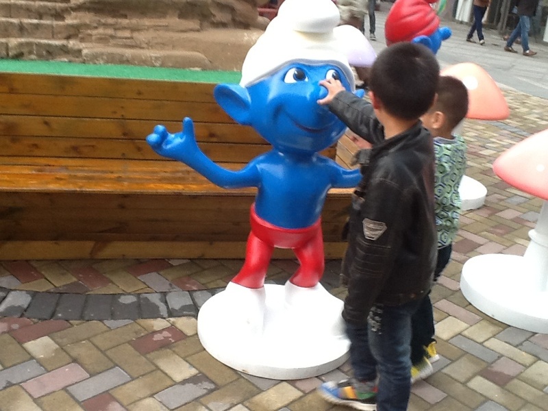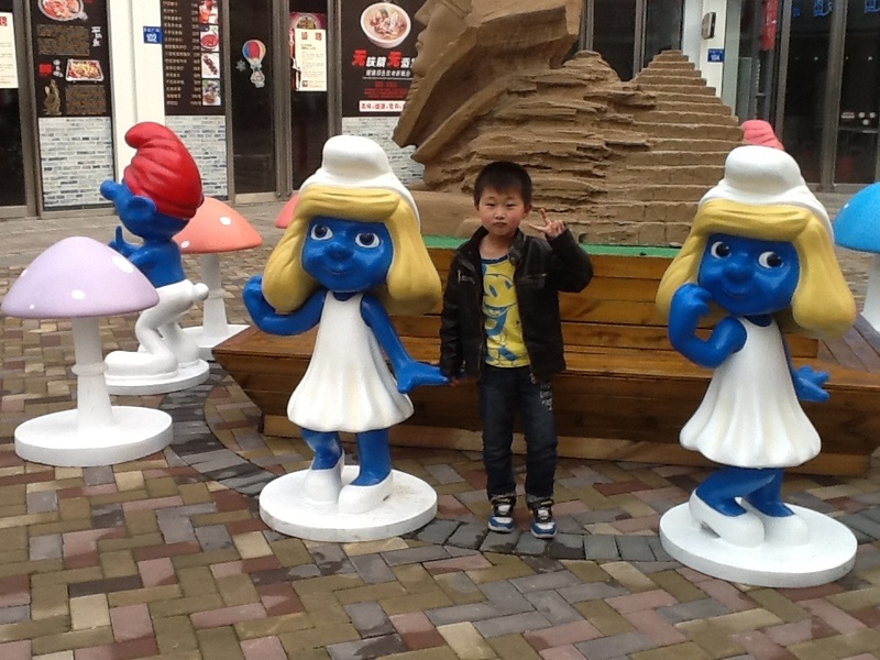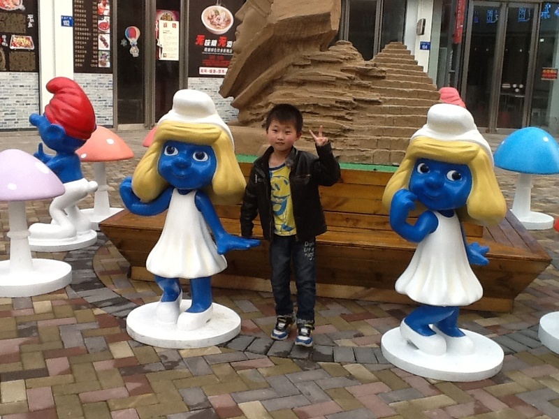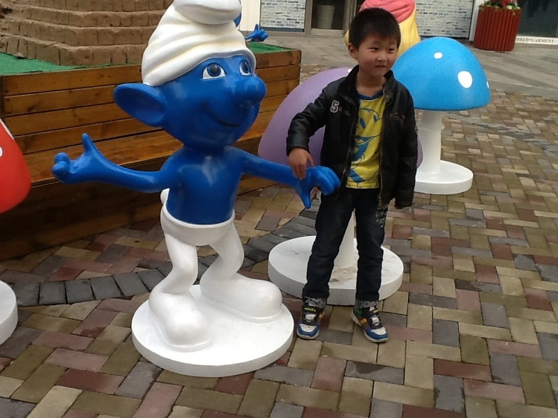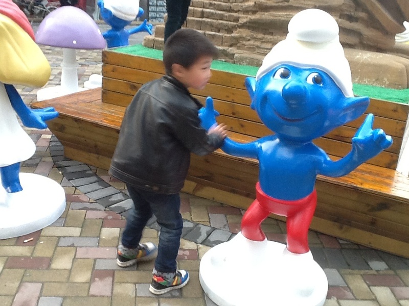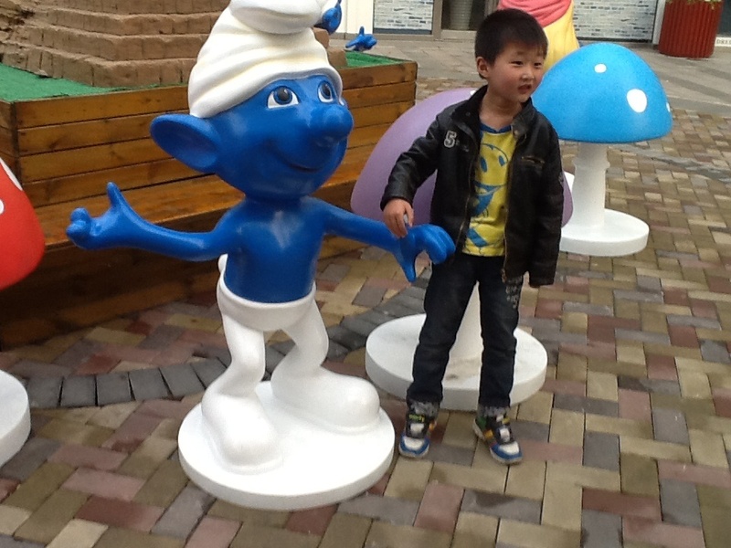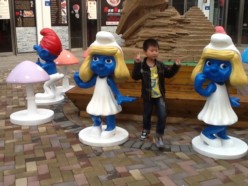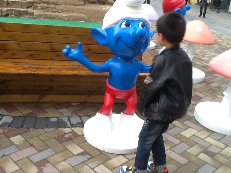 周末我们上完英语课,点点就要去万达吃点好吃的,我问点点喜欢吃什么,他说要吃狐狸家酸奶,于是我们让爸爸送我们到万达,我们走到狐狸家酸奶店,谁知没有酸奶,正在升级中,于是我们只能去吃别的了,走过六号门的时候,看见了门口的一些蓝精灵们。