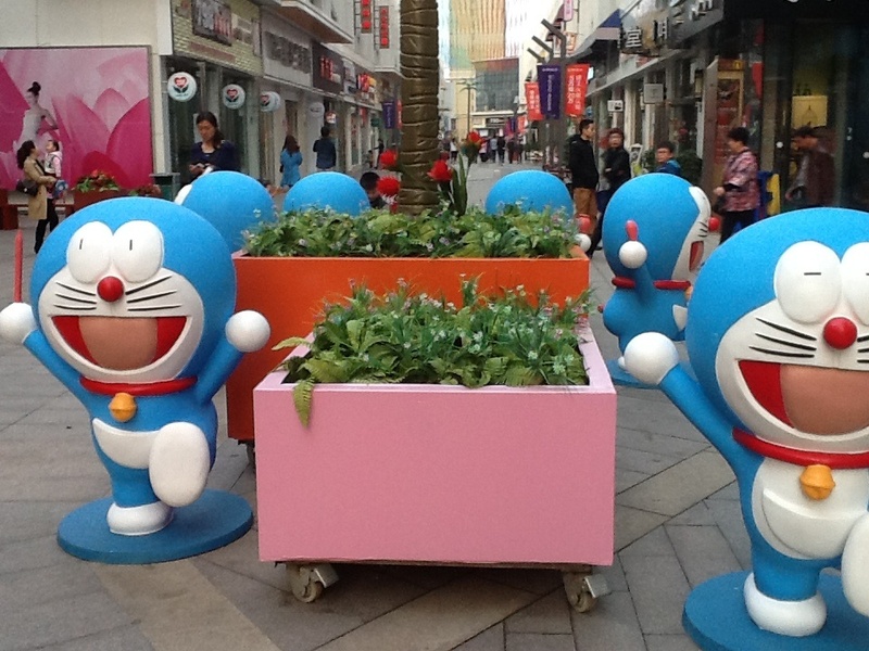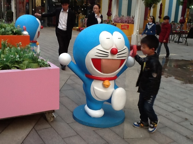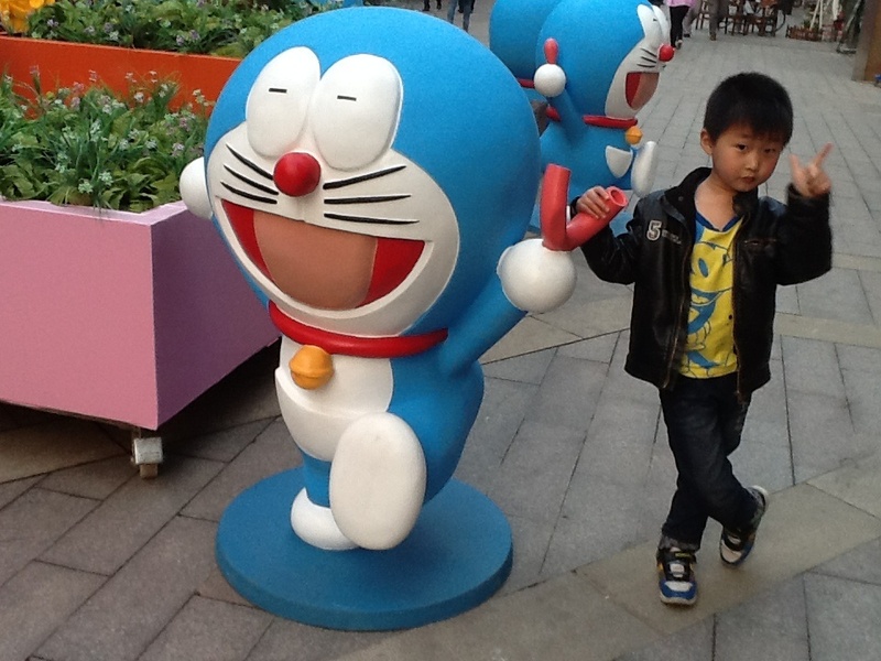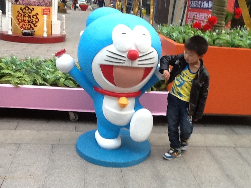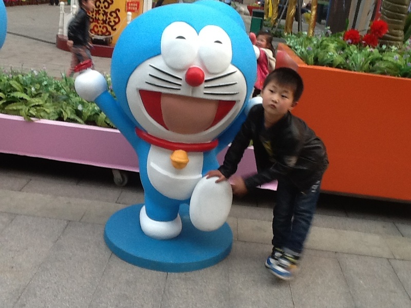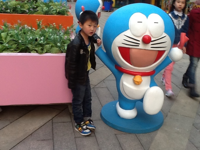 是的,在广场四周都摆了不同的动画人物造型,吸引小朋友们过来观看拍照,这就是商业营销策略,昨天我们看到了一些蓝精灵,今天就看到了哆啦A梦,真是幸运啊,据说前几天还有走迷宫的,我们今天就没有看见走迷宫,点点倒是很希望去走一走迷宫了。