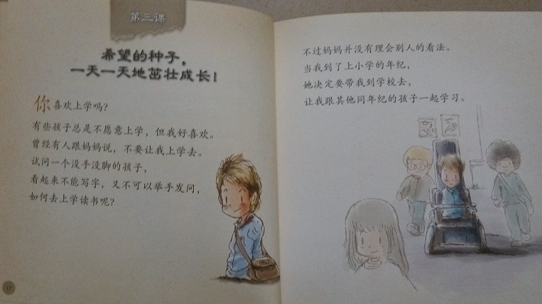 阅读日期:4月21日 参与人员:轩轩、贝贝和妈妈 阅读绘本:《希望的种了,一天一天地茁壮成长》 绘本特色:要有面对失败的勇气 适读年龄: 3岁以上 阅读心得 精装的书,厚厚的封面,拿在手里的感觉都不一样,终于能理解爱书爱阅读的人都追求精装的书的感觉了。这本书里的故事都充满了爱,想着如果宝喜欢真想多给他阅读几遍。这次,是大宝自己拿来的书,刚收到书的时候看了几篇就放一边了,这次又拿来要我讲了。 对有些孩子来说,上学可能是最头疼的一件可,可是力克却不一样,虽然没有四肢的他和别人看起来不一样,但他却是一个非常爱上学爱读书的人,妈妈等到力克到了上小学的年龄,也坚持让他和其他小朋友一样上学。而勤奋好学的力克一直都有很不错的成绩,到了十二岁的那年,因为搬家转到了新的学校读书,而且被安排到了较高年级的班上,深奥的课程,不同科目转换不同的教室,这些困难令力克的成绩急速下降,于是,难过的力克经常一个人躲起来,有次躲在了音乐教室里,可是被老师发现了,当力克等着老师的批评的时候,没想到老师只是露出了慈爱的笑容,温暖地抱住了力克,并且鼓励他,只要用心努力去尝试克服困难,一切都会好起来。从那时候起,力克凭信心与坚持,不断地努力,终于取得了成功,二十一岁大学毕业,还取得了财务规划及会计双学位。 故事告诉我们,跌倒并不可怕,遇到困难也不要轻言放弃,而要把希望的种子种在内心充满勇气的沃土里,这样总有一天能收获成功的。 本作品未经作者许可不得转载,转载请征求作者意见。擅自转载使用,将保留追究其法律责任的权利! 评分记录