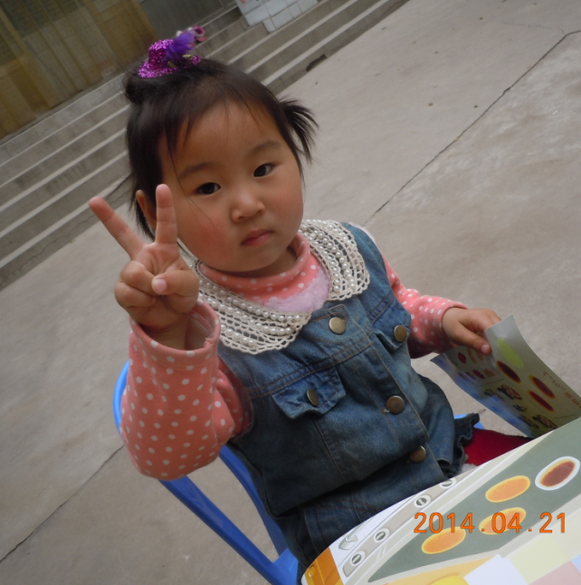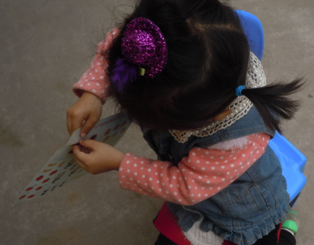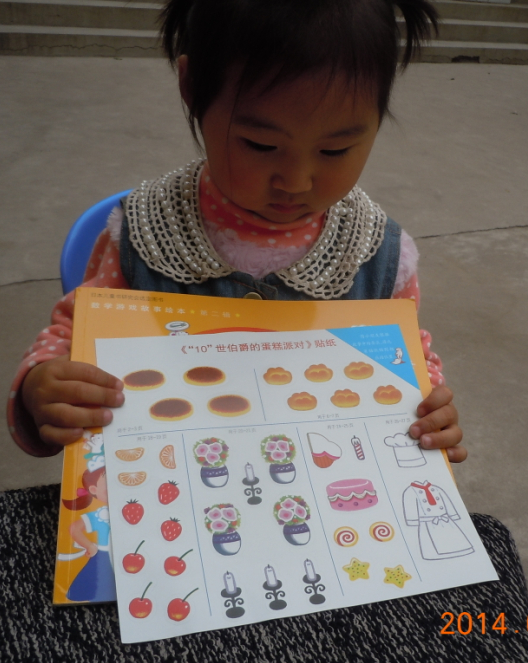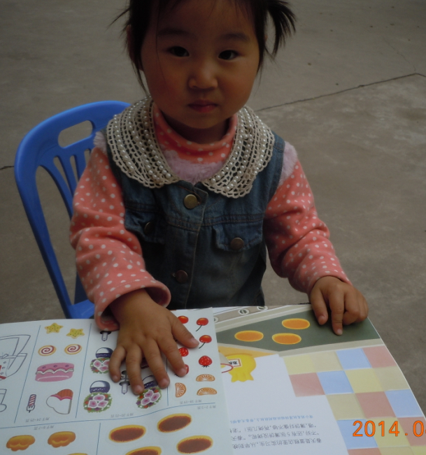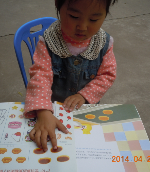 我告诉盼盼先让她把书看一遍,让她知道那里需要贴,在这里我告诉盼盼一个小窍门,那是就那里有小蓝色的字那里就可以贴,盼盼很快就可以找到,当我问盼盼在那里贴的时候,盼盼迅速就可以给我指到,虽然盼盼现在认识数字,但是盼盼现在还不会加减法,他还不知道要贴几个,我只问盼盼这里有几个,盼盼说有三个,我问她贴几个,她就不知道了,借这个可以教一下盼盼加减法了,我告诉盼盼这里一共有五个,这里已经有三个了就差两个了,盼盼知道了5-3=2了。