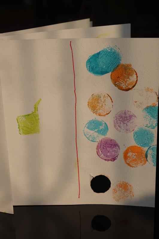 第一次看到这本书的时候,我的脑海里立刻闪现出一个念头:我可以和孩子在阅读完毕后一起制作这本绘本。经过了几天的阅读,我觉得儿子对这本书的内容已经很熟悉了,自己印绘本的时机成熟了。昨天晚饭后,我跟儿子说,是否想和妈妈一起把《小方和小圆》印出来?儿子满心欢喜。于是,我们先一起制作了几页空白绘本,然后挑出方形和圆形的积木,用指印画材料开始印绘本。 我边给儿子讲《小方和小圆》的内容,边和儿子一起印绘本。有的时候真的会有这样的感觉,儿子印的既是绘本,也是艺术。例如,第一页小方和小圆是好朋友,虽然家里的指印画颜料只有四种颜色,但感觉儿子印出来后真的非常美。再如,到后面校园门聚在一起开会讨论如何让小方进到房子里来的时候,姥姥一起加入我们印画的过程,开会了,小圆门围坐在一起,仿佛一个圆桌会议。边说清洁边印,边印边推进清洁的发展。我们就这样说着、印着。最后,由我来完成书中的两个门——用剪刀剪处一个圆形的门和一个方形的门。 哈,绘本印好了(其实还差最后一个封皮),一本属于儿子自己的绘本。接下来,让儿子拿着自己的绘本开始给我们大家讲故事。故事既有原著内容,也有他自己演绎的内容。例如第一页,儿子说:小方和小圆是好朋友,有紫色的小圆,有橘黄色的小圆……他们有时会打架(他指着自己印到一起的小圆门,嘿嘿笑着说。)我接着补充:不过,很快他们又和好了。)。第二页,宝说:妈妈你看,小方长脚了,他想进到屋里去。(其实,小方的教是他在印的时候留下的一小抹颜料) 故事讲完了,晚安去了。 p.s: 自制绘本的方法是几个月前,有幸在@接力出版社组织的一次讲座上,听到@方素珍老师的一堂公开课的内容,很受益。这次听后是第一次和儿子一起实践绘本。以后,我们还会做出更多更美的绘本。