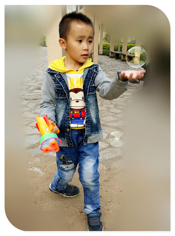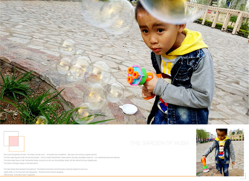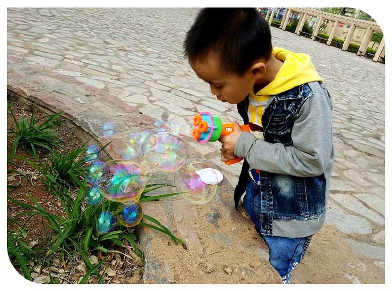 只需一下下就有超多的泡泡被发射出来了,小家伙看着泡泡在自己身边慢慢散去仿佛在感受一个神奇的童话一般。阳光的照射也让泡泡变得五颜六色的,谦是越玩越来劲,不停的打着泡泡,泡泡越来越多,简直能把谦包围起来了,小家伙不由得惊叹道:“哇塞,好多泡泡啊!”。一直以来,这个泡泡好像对于每个孩子来说都是无法拒绝的事情呢,无论是伸出小手跑来跑去的追泡泡还是拿着各种工具来制造泡泡都会带给孩子美好的玩耍时光的,现在写贴的时候不禁回忆起宝贝当时玩泡泡枪,追逐着抓泡泡的情景来都会从心里感到快乐。