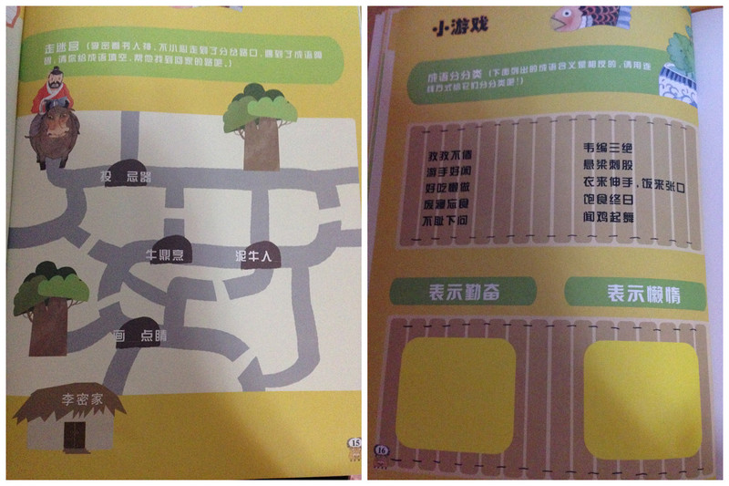 ![]() 阅读时间: 5.1 阅读成员: 妈妈 宝贝 绘本特点: 成语小游戏,让孩子掌握更多的成语,帮助孩子理解每个成语的含义。 适合年龄: 4+ 阅读心得: 昨天讲的牛的成语故事,也做了几个小游戏,今天儿子提出还想做小游戏,连故事都不听了,要直接做题。我发现儿子特别喜欢做题目,归结到底还是喜欢,还是有兴趣,所以不需要我去说什么他就会主动学习的。那我 就按儿子的要求我们选择了后面的两个小游戏,一个是迷宫的,这是儿子最喜欢玩的了;第二个是成语分类游戏,这个知识点比较多,需要把每个成语的含义讲出来,才能最终做出正确的答案来。 第一个游戏迷宫,意思的李密(因为没有讲前面的关于李密的牛角挂书的故事,自然就不知道李密是谁了,不过儿子对这个人物并不会影响他走迷宫)看书看的出神,不小心走到了岔路口,遇到了成语障碍,请帮忙填空后找到回家的路。第一个成语“投鼠忌器”,因为讲过故事所以记住了,第二个泥牛入海和第三个牛鼎烹鸡就有点难了,完全不知道,第四个画龙点睛也不清楚,平时没有接触过的成语还是太少了,不过现在就是一个练习的机会,先告诉儿子,记住了然后再多走几遍相信成语也就会留下印象在脑中中的。 第二个游戏中涉及到的成语有孜孜不倦,游手好闲,好吃懒做,废寝忘食,不耻下问,韦编三绝,悬梁刺股,衣来伸手饭来张口,饱食终日,闻鸡起舞,我都一个一个的查了资料,用最易懂的表述方式告诉儿子之后,就可以分出哪些是表示勤奋的,哪些是表示懒惰的了。这些成语还需要多讲多记忆才会自己应用起来。 本作品未经作者许可不得转载,转载请征求作者意见。擅自转载使用,将保留追究其法律责任的权利! 个性签名