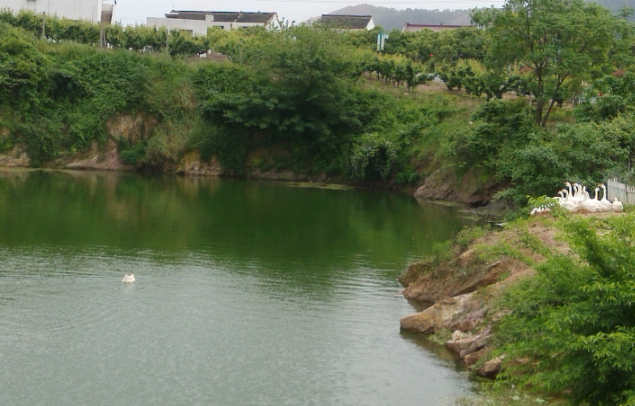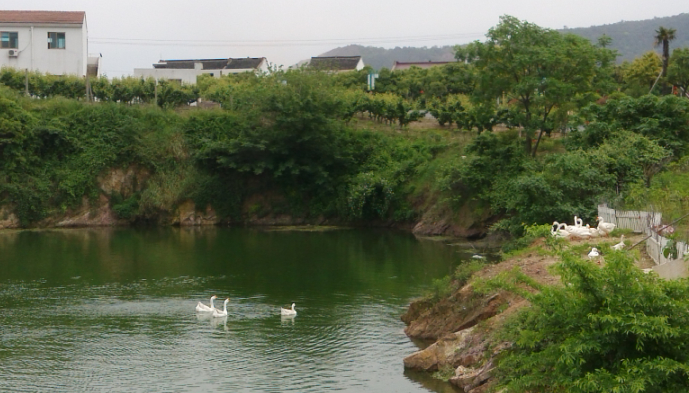 我们先到了池塘边看鸭子,从池塘边看看,对面的峭壁上面还有一片白色的小花,十分漂亮,一群鹅就在池塘边,池塘里面只有一只鹅在游来游去,小朋友们立刻想到了"鹅鹅鹅,曲项向天歌,白毛浮绿水,红掌拨清波。"的诗句。看起来小朋友们都很喜欢"咏鹅"这首诗啊。
