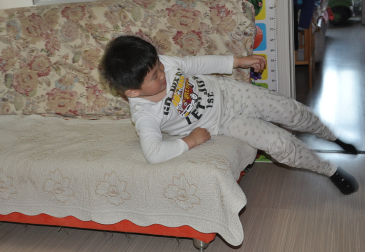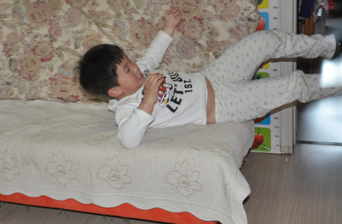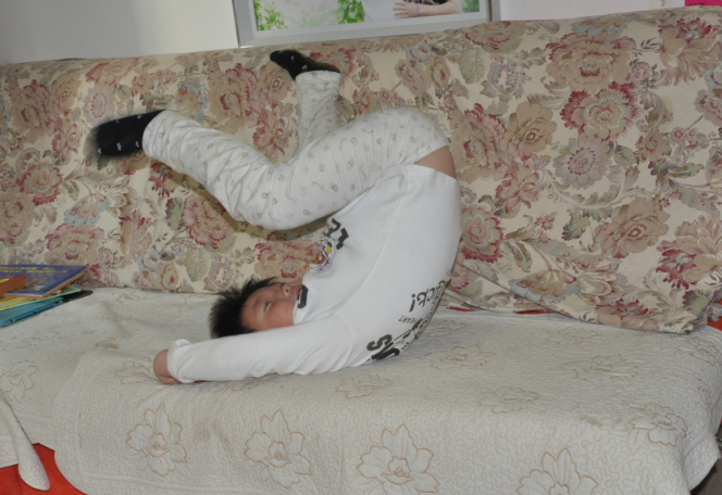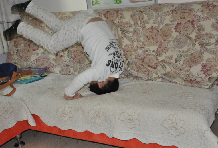 儿子见我出来看他了,马上摆好姿势,说要翻了啊。头挨着沙发,两条腿用劲蹬了一下,身体就起来了,动作还很标准啊。不过这一次并没有成功的翻过去,有点斜了,一下就歪到沙发靠背上去了。接着再来一次,前面的动作还一样,就是在翻的过程中掌握的不好,不是歪倒这边就是歪倒在那边了。没有成功几次,但儿子并没有放弃,我也在一旁鼓励着讲出每次出行的问题所在,告诉儿子下次一定会成功的,这个一定需要多练习才可以的,再来几次吧。