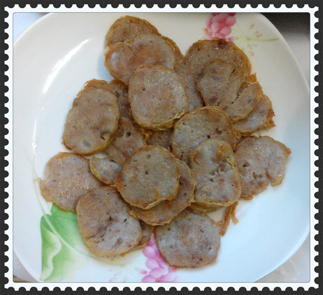 看,这里说是半斤,不过我觉得一餐多了,就切了三分之二来先。这个可以炒来吃,也可以煎来吃。大部分人都是煎来吃,比较香。因为肉卷已经是有味的了,所以不用再放什么东西的了。而且应该放了味精的,很甜。所以这东西不能吃多,偶尔解解馋还是可以的。我也不太敢给孩子吃,可以说是背着他来吃的。 ![]()