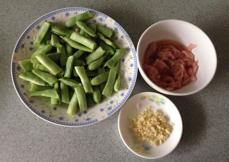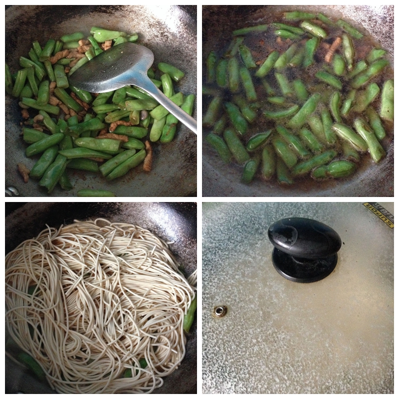 原料:扁豆半斤,肉丝一两,面条半斤(这是按大食量的一人份或者一大一小准备的,我们一家三口平常吃要翻倍的)。 配料:盐、料酒、酱油、姜末、大蒜。 做法: 1.扁豆洗净择好掰成小段;肉丝用料酒拌匀待用;大蒜拍好切碎。 2.锅中油热,放姜末,爆出香味后煸炒肉丝,变色后盛出。 3.翻炒扁豆,差不多时放入肉丝,继续炒熟,放入盐和酱油调味(扁豆炒肉您还喜欢放啥就放啥吧,丰俭由人)。 4.加入水,不用太多,让其没过扁豆即可。