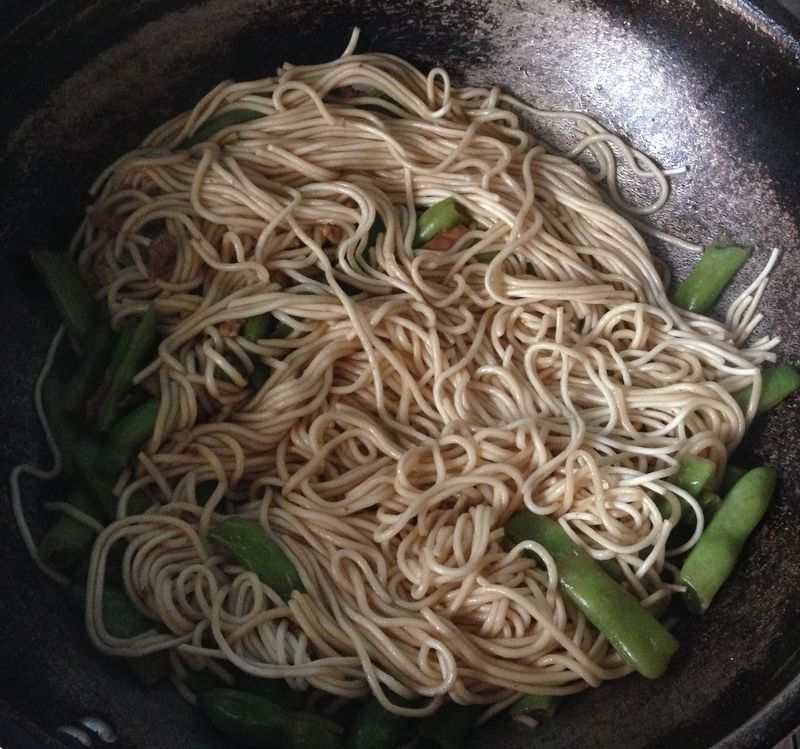 5.将面条均匀的铺在扁豆上面,让水气可以透上来,面条最好避免挨着锅壁,我感觉容易粘锅。 6.加上锅盖,中小火,慢慢焖着,大约十几分钟吧,有“兹兹”的声音,水差不多蒸干了,面条也熟了——话说我以前做总担心不熟,喜欢加点水再焖一会儿,结果又感觉太软太粘,扁豆太烂,这次买的面条比较细,刚刚好——要是自己擀面条就更强大了。 7.翻一翻,让面和菜充分混合。