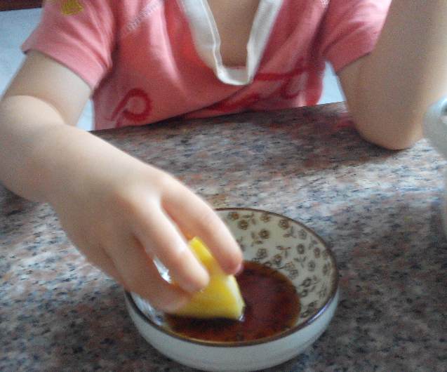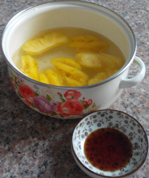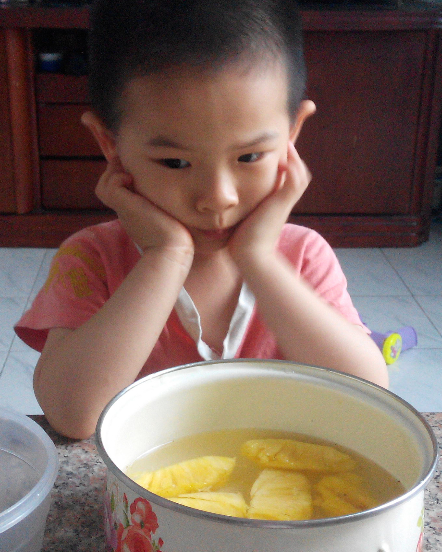 家里的三个小菠萝,已经慢慢成熟了起来,有一个看起来已经很香了,闻起来很香的味道了。而孩子,早就馋得不得了了。我决定,今天下午找个机会来把这个菠萝开了。不过我得先干活,早上状态不佳,没干什么活,下午就扫地拖地,还洗了很多的衣服。孩子都是在一边自己玩。等到他玩得不耐烦时,我也差不多要干完活了,于是我叫他继续自己玩,等我干完活,就要切菠萝了。于是,他有了新的盼头了,所以又安静地自己玩了! ![]() 激动人心的时候就要来临了!先给菠萝照个相吧! 这时,我已经准备好了砧板和水果刀了。切这个菠萝,对于我来说还不算是难事。 曾经我也帮某人创业在路边摊卖过菠萝呢! 不过时隔多年,当年的事早已经淡忘了,而且也基本忘记了以前怎么切菠萝的了。 ![]() 不管怎么样,先把头尾去掉,再切掉皮。 慢慢感觉回来了呢。 然后把那些一洞洞去掉,自然就形成了好看的沟沟了。看到没?这个波萝好小呀,我一个手掌能够轻松地拿着。 不过看到这肉,就知道非常香甜了,成熟度刚刚好呢,再留恐怕就会太熟了。 ![]() 然后切条,去掉中间的硬硬的芯,再放进盐水里浸泡。 ![]() 因为怕菠萝太热气,所以不敢马上给孩子吃,说要泡很久的盐水才能吃。 这个眼神,又是一个无比渴望的眼神。 我于心不怕,就去拿了两小包饼干来跟他一起分享着吃了,因为我也肚子好饿了,怕空腹吃菠萝不好。 ![]() 我们家乡的吃法,就是吃菠萝沾酱油,哈哈,有很多人可能会感觉很奇葩,不过这样确实挺好吃的。 于是,我倒了一小碟的酱油过来,同时也希望沾了酱油就没那么热气了。 ![]() 嘿嘿,味道好极了!很香甜,一点都不酸。比我们上次在外面买的好吃多了! 明天,再来一个吧!又是期待!