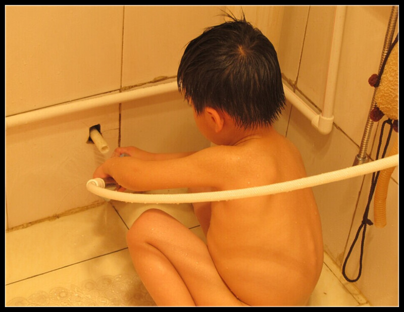 洗完了澡我要把洗手间冲干净,还得刷马桶,Aric说要帮我,我就把权利放给了他,也是想看看Aric的能力是多少。在我的指挥下,Aric把下水道口的头发都捞了出来,然后拿着马桶刷仔细的刷干净了马桶,接着把洗手间的地面、墙面冲洗干净,最后把自己踩着的垫子也冲干净贴在了墙面上,做完了一切,小家伙一用力,把浴盆里的水倒干净。说实话,我真的很佩服,想我5岁的时候还什么都得靠着爸妈呢,可是Aric却可以独立的完成所有的一切,同时Aric的内心也非常的高兴和满足。