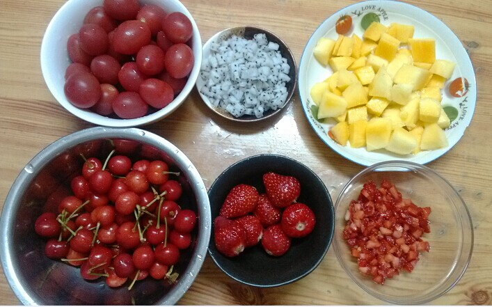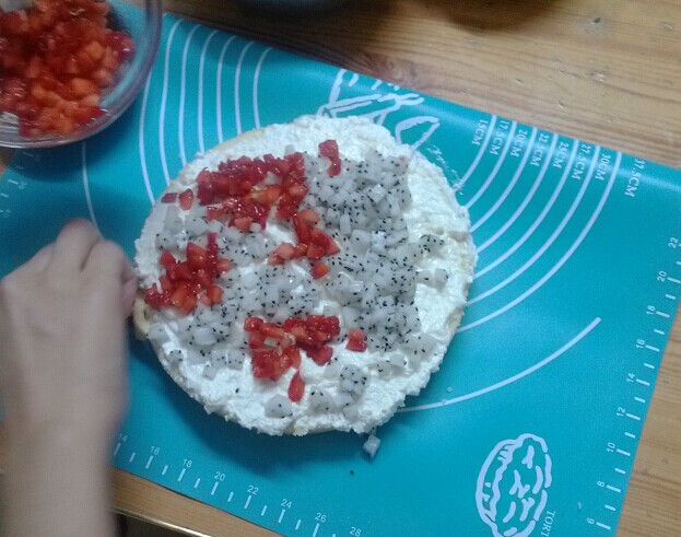 烤过几次戚风蛋糕后,一直想做一个真正的蛋糕试试,所以在收到了网购的奶油后,决定在儿童节为两宝试制一个儿童节蛋糕,在做之前还特意翻了烘焙食谱,了解到做蛋糕,除了打底的戚风蛋糕很重要以外,最重要的就是奶油的打发。而现在炎热的夏天奶油不仅不好打发,而且还容易化,所以有点难度。虽然有难度,但还是想试试。 ![]() 先烤好了一个8寸的戚风蛋糕,还算成功吧。 ![]() 在蛋糕冷却的空闲时间,准备了各种放在蛋糕里的水果,蛋糕中层要放碎碎的水果,我就把草莓和火龙果切碎了准备洒在蛋糕中间做夹心。水果准备好了,再开始打发奶油。真的应了那句话,温度高奶油不好打发。总感觉奶油打发不起来,结果打着打着最后打发过了,可是也不能中途放弃吧。于是接着往下做了。 ![]() 等蛋糕冷却后,把蛋糕从中间对半切开,涂上一层奶油,因为奶油打发得太过了,所以怎么涂都感觉是粗糙的感觉,不像蛋糕店里的蛋糕那么光滑,边做就边想着第一个蛋糕失败了。 ![]() 虽然粗糙,但还是接着做下去,洒上草莓和火龙果,然后再盖上一层奶油。 ![]() 把上面一层蛋糕盖上,接着继续涂奶油。失败粗糙的蛋糕呀。 ![]() 没有学过摆漂亮的水果蛋糕,将就着现有的水果随便摆了一通。之前想像地带宝妈那样做几朵芒果玫瑰放上去的,可是试了好久一朵都做不出来,最后还是放弃了,就这样随便摆摆了。 ![]() 蛋糕的成品出来了,重点步骤奶油没有打发好,看起来就是个失败的蛋糕,不过大宝还是非常给力,说妈妈做的蛋糕很漂亮,不知道是不是在安慰妈妈呢。最后把做好的蛋糕放入冰箱冷藏了1个小时再端出来吃,8寸的蛋糕不是很大,宝叫上舅舅一家,还有小姨,一大家子还是把看相不怎么好的蛋糕给解决了。大家的评价是,虽然蛋糕不是很好看,不过味道还可以。让我还担心了好一阵,怕蛋糕没人吃给浪费了。还得再尝试,争取下次能再做漂亮一点好吃一点的蛋糕。