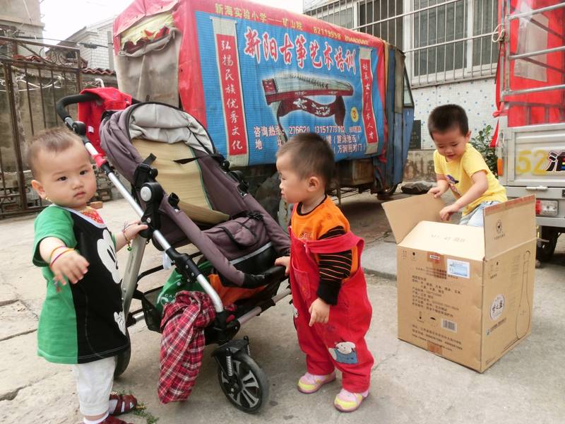 添翼推着婴儿车下来,他们俩就都跑到婴儿车旁边扶着车子玩了起来。而乐乐则看到身后有个巨大的纸箱子,打算钻纸箱子玩。
