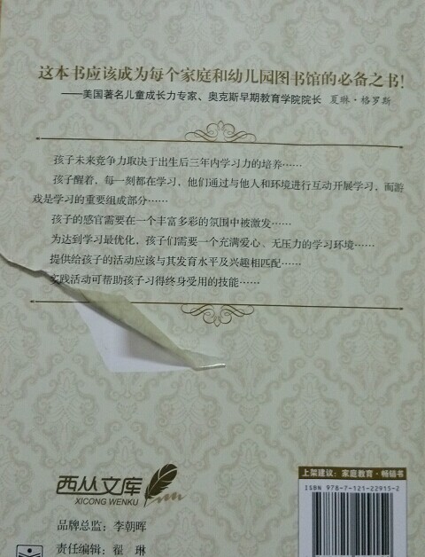 ![]() 《做孩子最好的潜能开发师》,美国苏珊.R.盖伦斯的作品,作者致力于早期儿童教育研究40多年,而此书的重点既涵盖了婴幼儿和学龄年儿童的最新大脑研究成果,讲述了大脑发育和孩子在不断学习中成长的奥秘,还提出了可操作性比较强的600多个早教方案,帮助家长将大脑研究的最新成果运用到日常亲子活动中。此书被誉为21世纪最重要的早期教育经典之作。 ![]() 书本的内容相当丰富,分为9个章节,从大脑发育的秘密、到感官、情商、社交、体能等等,还有婴幼儿的知到到学龄前儿童的认知,读写能力等等,内容面相当地广泛。首先讲到的就是大脑发育的秘密,告诉我们想要创建一个无压力、丰富且富于挑战、有益于幼儿学习的环境,就必须要了解一些脑生物学知识。书中以浅显易懂的语言讲述了大脑的秘密如何与孩子的成长息息相关,让我们这些非专业人士也能容易就看明白。 ![]() 书中针对婴儿、幼儿到学龄前儿童,告诉我们如何通过调动感官(听觉、视学、触觉、味觉、嗅觉、运动感觉)带给大脑刺激大脑反应;还有提升婴幼儿情商的活动,和孩子练习情绪的技巧,如何培养有韧性的幼儿,注重情感发育,提高孩子的情商;如何引导和提高孩子的社交技能,教孩子学会如何处理冲突;如何给孩子创造合适的生存环境,发展体能;孩子的认知和语言能力发展;如何让学龄前儿童的读写能力更好地萌芽等等。逐个方面的内容从解释到具体的操作方法或案例都写得非常详细。看完以后,受益非浅,很多方法都可以照着书里的实践,有点小遗憾这么丰富的内容为什么没有更早一点了解和学习。 ![]() 某些案例和活动都非常实用,比如:书中列举的各种丰富有趣的科学探索活动、给孩子创造各种艺术鉴赏活动、提高语言能力的方法和活动,如何为孩子创造室内活动和户外活动,甚至在体能发展一章还提到了如何为孩子提供健康零食,制作方法多样化。真的是让我大开眼界了,以后还可以照着书里做给宝宝吃。内容太丰富,只能简单列举一下。 ![]() 脑科学研究告诉我们,孩子的醒着的时候,每一刻都在学习,就看父母怎么引导和发掘孩子的潜能了。希望我也能和天下的父母们一样,尽量为了孩子做一个伯乐,发掘出孩子的无限潜能。 ![]() 说了这么多,来看看此书的真面目吧。 ![]() 书本内容简介 ![]() 作者简介 ![]() 书本目录 ![]() ![]() ![]() 书中内容 ![]() ![]() ![]() ![]() ![]() 书还没看完,封底就被小宝给撕坏了。 ![]() 看看大宝的姿势,说自己和封面的小朋友一样,是超人呢。