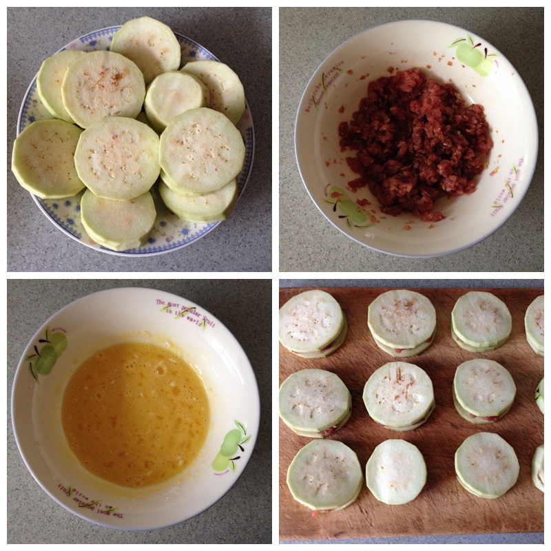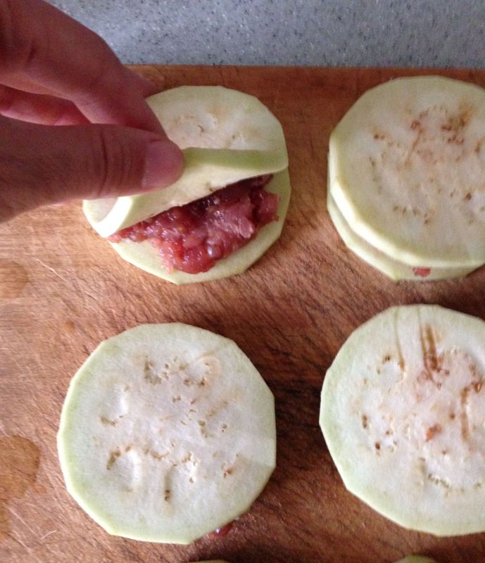 做法: 1.肉馅用调味品拌匀,口味按自己喜好。 2.茄子切薄片,两片之间勿切断,其中装入肉馅。选长茄子,是因为这样切的圆相对较小,好熟,吃的时候也好夹。
