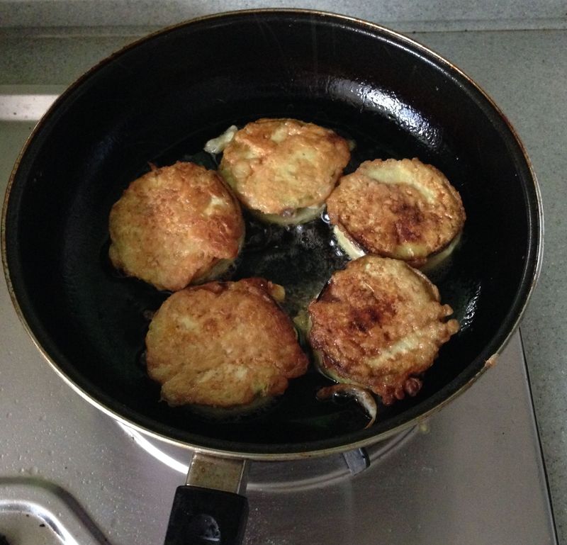 3.蛋液打散,加少量生粉调匀。 4.锅中(感觉平底锅受热均匀,所以用的这个)油热后,每个茄盒裹上蛋液,依次放入锅中。 5.调小火,慢慢煎,待茄盒一面金黄后翻面,直至煎透,里面的肉馅全熟。 6.盛盘,开吃。