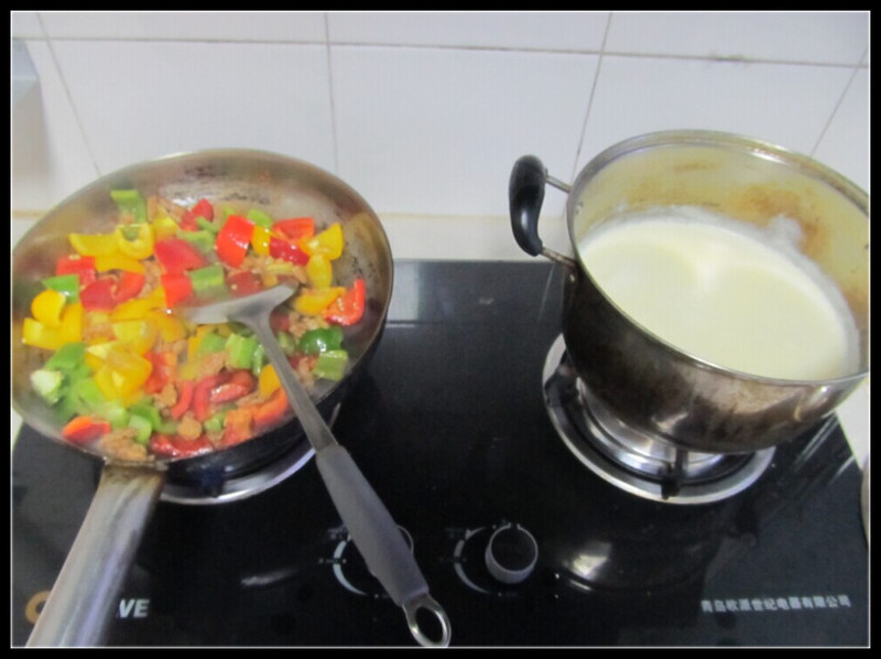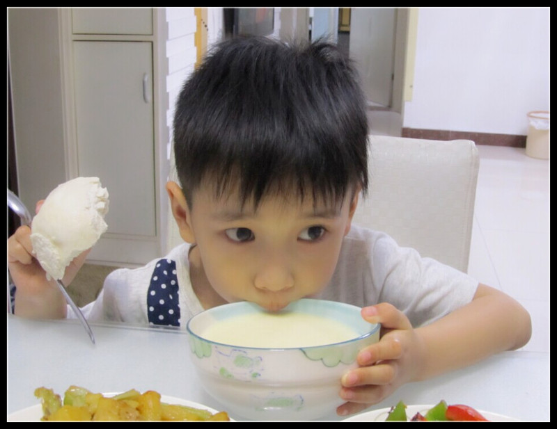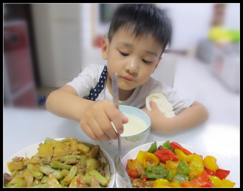 ![]() ![]() 有一次Aric回家告诉我,他在幼儿园里吃了非常好吃的菜,我问他是什么?他说是辣椒。我就纳闷了,Aric一直不能吃辣椒的啊,怎么在幼儿园就吃了,而且还那么喜欢?他接着告诉我,原来幼儿园里的辣椒和我做的不一样,有很多很漂亮的颜色,味道也是甜甜的,直到后来我询问了老师才知道,原来他们那天吃的是幼儿园特地给小朋友们做的彩椒,有红椒、黄椒、青椒等不同的辣椒做出来的,根本不存在辣的味道。 ![]() 今天去买菜的时候,还在为做什么而纠结,就听到Aric喊我,他看到了五颜六色的辣椒了,想吃幼儿园的那个菜,让我今晚做给他吃。我想了想,这不难啊,不就是青椒炒肉嘛,虽然不单单只是青椒,做法却是一样的吧。买了红椒、黄椒、青椒各一个,原谅我不太自信炒的对不对,就想着尝试一下,反正三个彩椒加起来也绝对够一盘菜了,又切了里脊肉,还买了点其他的菜和豆汁,回家给儿子做饭去喽。 ![]() 把菜和肉洗干净后,切好了放在盘中,就开始给油锅加热,然后先炒肉,我一直都是这么做的,应该都是这样做的吧,哈哈。炒肉我比较喜欢炒的嫩一些,我妈就爱炒的特别老,不过我发现,我家爷俩都比较爱吃嫩点的肉,还好还好。然后加入味达美(酱油),炒到了8、9成熟了,把切好的彩椒倒入锅中翻炒,差不多了就加入适量的盐和鸡精,最后在关火的时候,滴入两滴香油,这是跟我妈学的,她习惯性的放香油,恩,味道还是很不错滴。 ![]() 然后又开始炒米豆,我也不知道其他地方这是叫什么,我们这里是叫米豆的,米豆的米是二声的那个字。米豆炒肉的做法和青椒炒肉一样的,在这里就不详细说了。反正只有我和Aric两个人吃,两个菜绝对够了。煮了豆汁,热了馒头,我俩就开吃了。吃的时候Aric依然不忘了闹腾一番,要不转头看看电视,要不就是装成弹琴的样子,不过吃饭是真的吃的不少呢,这孩子不知道是要长个子还是长胖,每顿饭都得接近一个大馒头,一碗稀饭,N多的菜啊,不过,能吃是福,使劲吃吧。 ![]() 边炒菜,边熬着豆汁,嘻嘻,俩不耽误 ![]() 貌似切的太大了,下回切小一点。 ![]() 米豆土豆炒肉,比较实在的菜啊 ![]() Aric可能饿坏了,一个劲的吃,小猪一枚。 ![]() 我比较爱煮豆汁喝,省事。 ![]() 这小子吃着吃着,不忘了回头看看电视,平时我们是不允许看的,但是今天老公不在,Aric就有点放纵了。 ![]() 每顿饭总得来点稀得,要不多噎得慌啊。 ![]() 这个爱捣蛋的小子,吃饭的时候总不能消停。