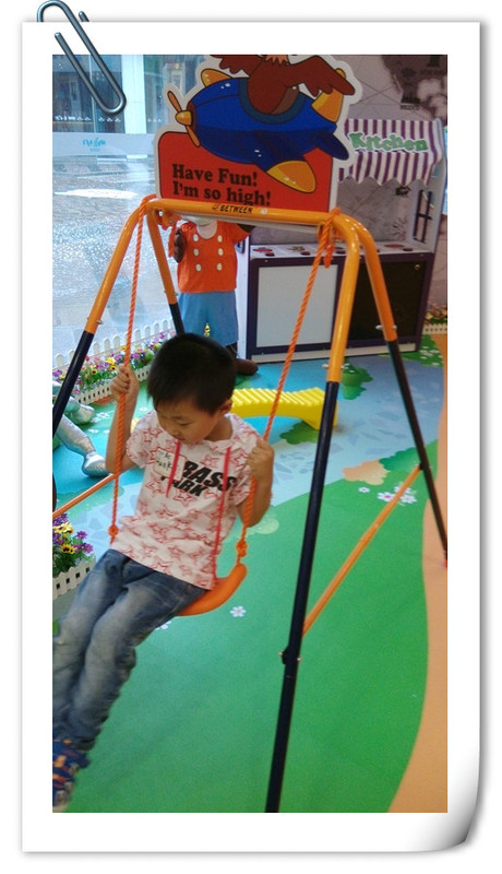 在上课之前,我们参观了一下几个教室,这里还有一些活动区域,有小朋友可以荡秋千,还有一些发声字母的学习,还有一些试吃的饮料和糕点,点点去游戏场所玩了一会儿,荡秋千了,荡来荡去挺好玩,点点还是小时候经常玩荡秋千,最近我们都没有玩过荡秋千了。