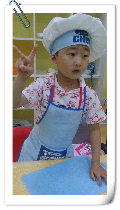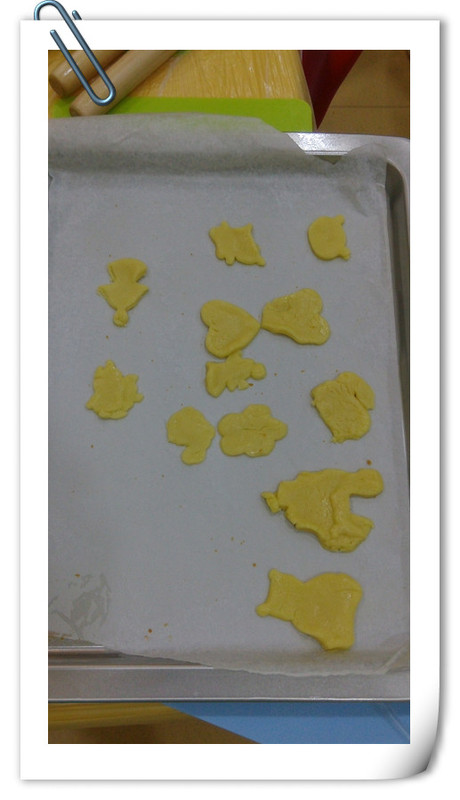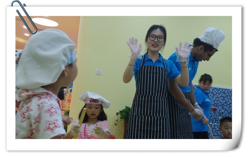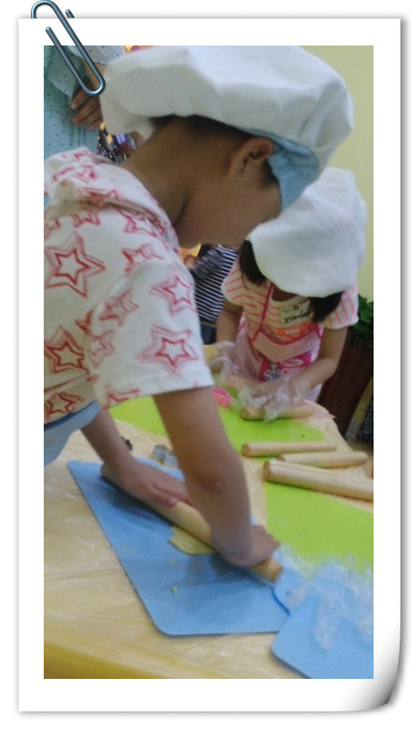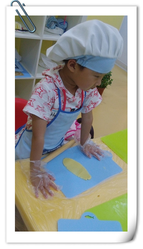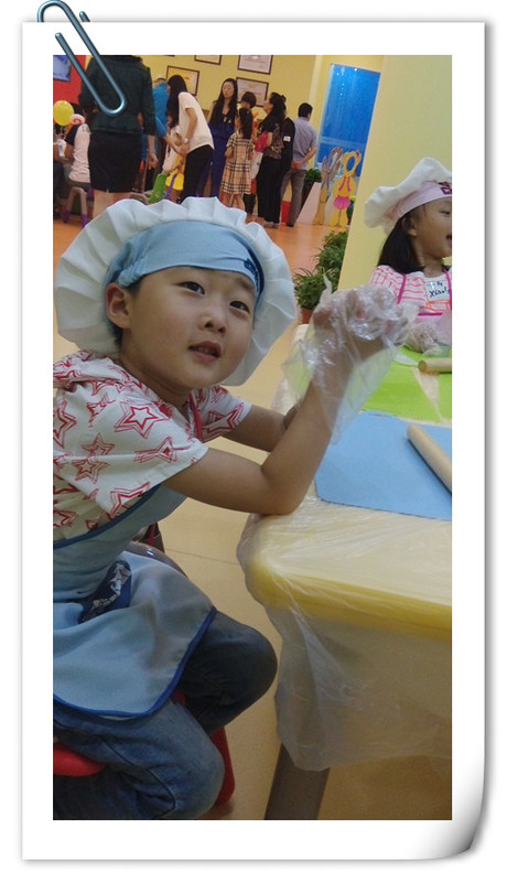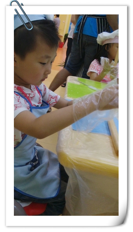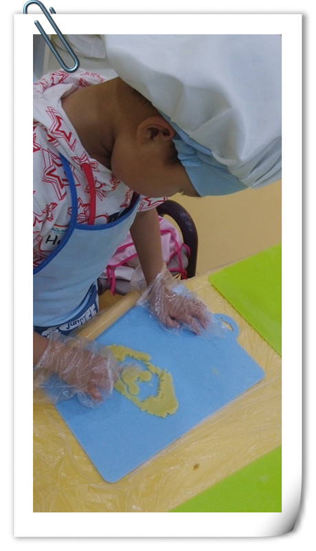 玩了一会儿,点点就跟着老师进入烘培课堂来,老师给小朋友穿上衣服,带上厨师帽子,然后教小朋友怎么样柔和面粉和黄油,揉好以后就给小朋友每人发了一个小面团,然后教小朋友如何做饼干。首先就用擀面杖把面团揉平,揉到一定的厚度,用上模具刻出各种形状,然后把刻出来饼干放在烘培的盘子里面。最后就是拿着这些饼干放在烘培箱里面烤饼干了。