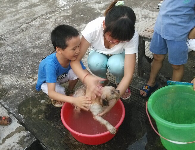 ![]() 大宝看到我们比平时早了一个小时来接他,就好奇地问我们去哪儿,我告诉他去坪山的哥哥姐姐家玩,小家伙听了就开始兴奋了,还说很久都没有去了。一路上两个小家伙在车里就没有消停,一会儿这样一会儿那样,还要开音乐扭着屁股跳舞,小宝连车也不晕了。不知道是不是因为最近周末经常出门,坐车比较勤快,所以不太晕车了。 ![]() 一下车大宝就去找刚放学的哥哥姐姐们玩了,而且这次来还有新发现,就是多了一条非常可爱的小狗狗,这对超级喜欢狗狗的两宝来说,简直就是惊喜中的惊喜。狗狗的名字叫“花花”,可花花却相反,因为对两宝有陌生感,看到宝贝们走近,他就开始躲了。不过没过多久,还是很快就和狗狗混熟了。 ![]() 晚上吃过晚饭,大姐姐说要给狗狗洗澡,把孩子们高兴得上窜下跳,都来围观了。一群小朋友都在旁边围观,只有大宝胆子特别大,坚持要和姐姐一起帮狗狗洗澡。平时只是看看狗狗,顶多也是摸摸,这还是第一次给狗狗洗澡呢,把小家伙高兴坏了。我让小宝也一起去给狗狗洗澡,小宝有点不敢,只在旁边看着。 ![]() 在给狗狗洗澡的过程中,姐姐问宝贝,要不要把这只狗狗带回家,大宝高兴地连连说要要,恨不能马上抱走。 ![]() 看看这么多的孩子,大大小小五六个,都快可以开一个托儿所了,呵呵,听表哥说,等放了暑假,小朋友会更多了。 ![]() 两宝迷上了哥哥的新玩具,小台球,小哥俩一人站一边,玩得很有劲呢。