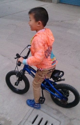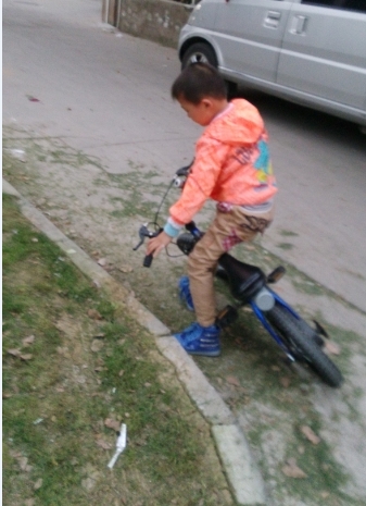 初学骑两轮自行车,感觉新鲜新奇 ——学骑自行车第一天 最近朋友给我们一辆自行车,这辆自行车是我们去年互换的自行车,因为点点去年骑这辆自行车还太大了,所以就骑了朋友的小自行车,现在换回来了,就可以骑这个大一点的自行车了,点点还是喜欢原来的小自行车,不喜欢大一点的自行车,于是我们就劝说点点要骑会自己的自行车,那个小自行车要拿回乡下了,于是我们就开始学骑自行车了。 学骑自行车对于点点来说也是一个不小的挑战,点点本来就是不擅长于运动,所以拿掉了自行车旁边的小咕噜就是很难学会的,需要坚持一段时间的。 我们在楼下学骑自行车,我说我们把自行车的小咕噜去掉吧,点点不愿意,还是希望有小咕噜才能骑,我说下了小咕噜会更好骑一点的,然后点点就坐上去试试,骑了一会儿只能坐在上面走走,根本骑不起来,然后练了半小时,点点就不肯练习了。 然后我说:“妈妈陪你学,妈妈在后面扶着你,点点就大胆地骑啊。”点点说:“好的,我要胆子大一些。”然后点点就胆子大起来了,妈妈在后面扶着,这下妈妈很累,因为要扶着自行车,还有点点一个人,重量都在妈妈的手上,扶了几个来回,手臂吃不消了,就让点点自己练习, 点点自己练习的时候还是要倒下去,找不到平衡点,骑了两圈以后,然后点点说已经很累了,然后我们就上楼了,准备明天继续练习。