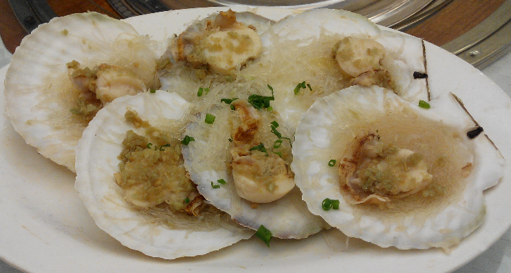 这是粉丝蒸扇贝,我们很喜欢吃的一道菜。小羽直接拿着那个贝壳当碗一样在吃,很开心呢!