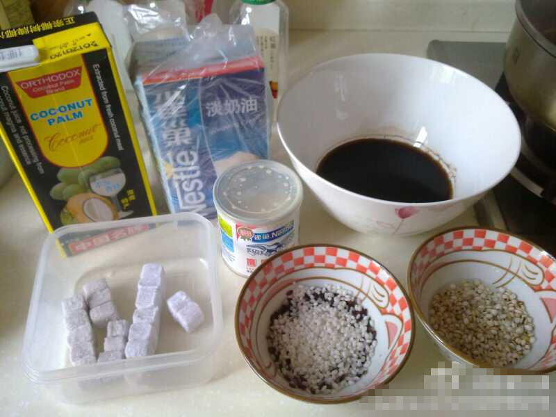 首先,肯定是不可或缺的仙草。这仙草怎么做?不用担心,原来有一样叫仙草粉的东西,用水冲调,降温后自然就结成了这黑黑果冻般的仙草了。 接着是芋圆,我在网上搜了一家口碑极好的手工芋圆铺,店家用冰包送来了加工好的芋圆。 其它的配料我就选了血糯米、糯米和薏米。薏米具有清热排脓的功效,非常适合夏天吃。 为了增加口感,我还买来了炼乳添加其中。
