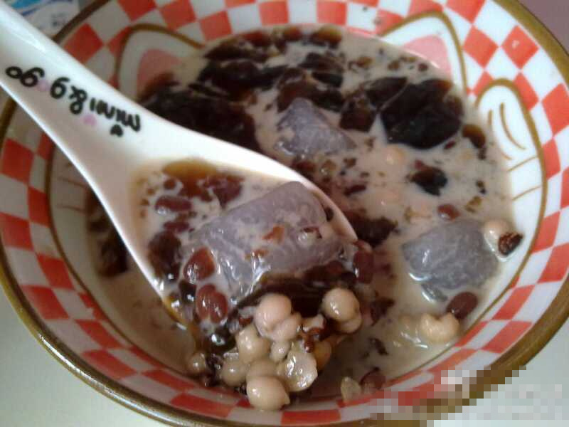 材料都齐备以后做法很简单,先冲调好烧仙草等它凝固备用。然后将浸水软化的血糯米、糯米和薏米小火慢炖。约莫一小时后盛出。再在锅子里煮熟芋圆,待芋圆浮起沥水取出。最后用椰汁作为汤底,添加淡奶油、炼乳适量,美味的芋圆烧仙草就制作完毕了!