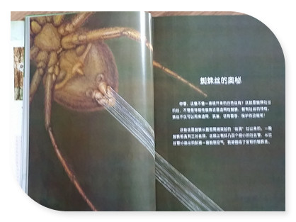 阅读日期: 2014年7月10日 参与人员:妈妈和宝宝 阅读绘本:《小牛顿科普馆—蜘蛛丝的奥秘》 绘本特色:生动活泼的文字、大量的摄影插图、快乐的氛围中领悟科学的奥秘,堪称优秀的科普读物 适读年龄:7-12岁 阅读心得: 继续《小牛顿科普馆—蜘蛛丝的奥秘》。蜘蛛之所以能够让孩子们感兴趣可是离不开蜘蛛织网的强大本领,但是关于蜘蛛吐出的丝还有很多你不知道的奥秘呢!蜘蛛丝不仅可以用来造网、筑巢、还有警告和保护的功能呢!首先要介绍一下蜘蛛丝是从哪里吐出来的。是从蜘蛛腹部尾端凸起的“丝疣”吐出来的,一般蜘蛛丝都具有三对丝疣,丝疣上有好几百个细小的吐丝管,从吐丝管里分泌出的粘液一接触到空气,就凝固成了坚韧的蜘蛛丝。