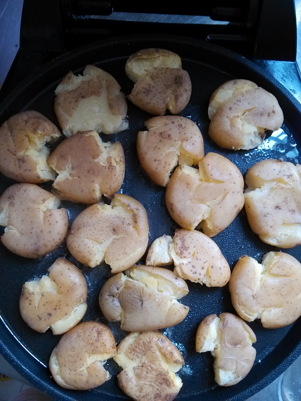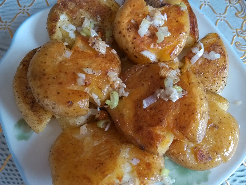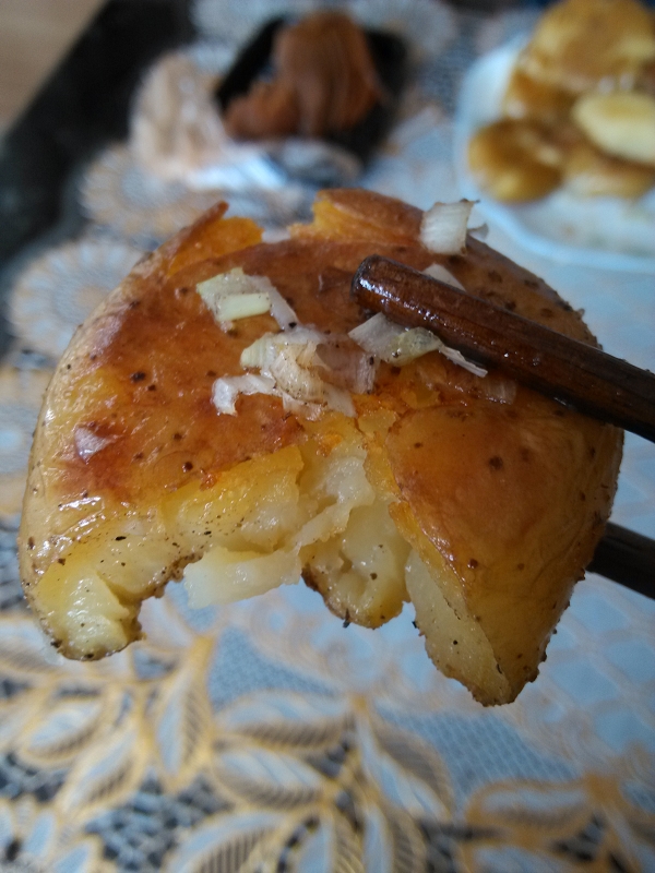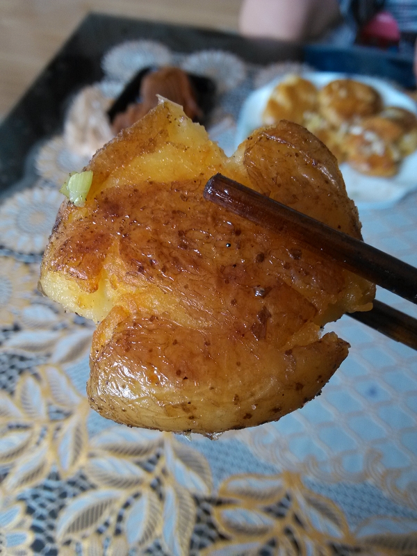 挖到的大土豆基本都炒着、炖着或者烙土豆饼吃了,小土豆本来是sam奶奶打算晒土豆干的,被我要来,改造了一番,于是有了下面的椒盐小土豆啦~~ 土豆,学名马铃薯,别名洋山芋、洋番薯、山药蛋。它和玉米、小麦、水稻、燕麦被称为世界五大粮食作物。土豆因其营养丰富而有“地下人参”的美誉。其块茎中约含淀粉15-25%,蛋白质2-3%,脂肪0.7%,粗纤维0.15%,还含有丰富的钙、磷、铁、钾等矿物质及维生素C、维生素A及B族类维生素。祖国医学认为,土豆性平,有和胃、调中、健脾、益气之功效;能改善肠胃功能,对 胃溃疡、十二脂肠溃疡、慢性胆囊炎、痔疮引起的便秘均有一定的疗效。(见百度) 椒盐小土豆 主料:小土豆 配料:椒盐 小葱 1.先将小土豆洗干净,放锅里加少许煮熟,大约15分钟 ![]() 2.用锅铲讲土豆平压一下,让土豆有自然的挤压,不用剥皮哦 3.电饼铛放适量花生油,将土豆放入 ![]() 4.掌握火候,煎到两面金黄即可 ![]() 5.出锅之前撒上椒盐、葱花 ![]() 6.装盘 ![]() 香香的椒盐小土豆来啦 ![]() 香香脆脆的 ![]() 味道很不错哦~~ ![]() 本作品未经作者许可不得转载,转载请征求作者意见。擅自转载使用,将保留追究其法律责任的权利! |