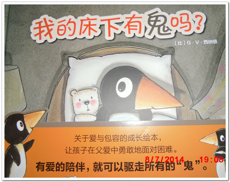 阅读日期:7月9日 绘本特色:这是一本关于爱与包容的成长绘本,让孩子在父爱中勇敢地面对困难~ 阅读年龄:0-8岁 阅读心得:《我的床下有鬼吗》初次拿到这本书,总感觉有点阴森可怕的感觉,所以当宝宝在晚上睡觉前提出要讲这本故事时,被我一口否决“夜里不听这本书了吧,太吓人的”,可宝宝坚持要讲,因为在宝宝认为,只要是妈妈讲的故事,再可怕他也喜欢。 可听当我讲解到前面的几页内容后,就发现自已被标题误解了,因为这本书虽然提到了“鬼”,全内容却没有一点可怕的,反而越读越感觉温馨。书中的小企鹅杰克单独睡在一个房间里,在睡觉前,它一会听到“吱吱、吱吱、、、、、、、"的声音,就误以为他房间里有鬼,等把爸爸叫来,爸爸告诉他“孩子,世上没有鬼,不信你看”,然后让小杰克看看他认为有鬼的地方,确实什么都没有。杰克放心了,可不多功夫,杰克又听到“扑通、扑通、、、、”的声音,然后爸爸再次来到杰克的房间,把杰克认为有鬼的地方都查看了一遍,可什么都没有,这下杰克放心,可以和爸爸互道“晚安”放心地睡了。 一本温馨有爱的故事,让孩子在爱的陪同下,健康快乐地成长! 本作品未经作者许可不得转载,转载请征求作者意见。擅自转载使用,将保留追究其法律责任的权利! 个性签名