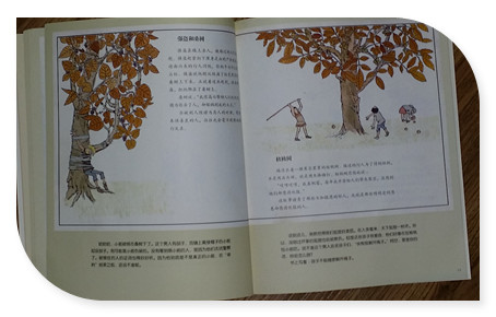 阅读日期: 2014年7月28日 参与人员:妈妈和宝宝 阅读绘本:《狐说伊索寓言II》 绘本特色:安野光雅作品,重温寓言的智慧和人生哲理,欣赏淡雅水彩画,激发创新潜力 适读年龄:5岁以上 阅读心得 继续阅读《狐说伊索寓言II》中的寓言故事,这次讲两个和树有关的寓言故事。看画面左右两棵树大致的看一眼是不是都差不多啊,比如树的大小、树叶的颜色等等。可是如果你让孩子仔细看的话就会发现这是两颗完全不同的树,左面的树是桑树,看到树上结的果子没,应该就是我们平时吃的桑葚吧。右面的树是核桃树,树上的果实是核桃,而且两颗树的树叶形状是完全不一样的,自己没见过核桃树的,都不知道具体长的啥模样,但是通过对比观察树却是一个锻炼孩子观察力的好机会。