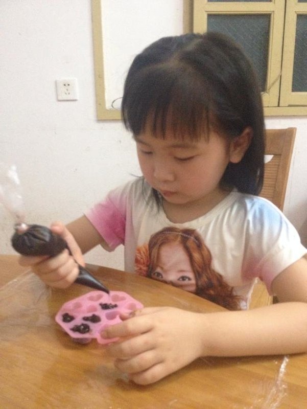 ![]() 没有到网上买那种专门用来DIY的巧克力块,用的是超市买的,黑巧克力、牛奶巧克力(拆开了才知道是草莓味的),而且发现买的是代可可脂的,不宜多吃呢。以后再做最好网上选购或买纯黑巧克力好一些。 ![]() 材料:巧克力(黑、白各一块)、模具、裱花袋 ![]() 制作过程: 1、将巧克力块切碎,越碎越容易溶化 ![]() 2、切好的巧克力碎装进裱花袋,收口扎紧。放入碗内,倒入开水,静置几分钟让它慢慢溶化。 ![]() 3、融化好后,在裱花袋底部剪个小口子,就可以开始DIY了。请我们的小朋友来帮忙,小妞觉得很好玩。 ![]() 4、做好后,放冰箱冷藏,不到半个小时就凝结成型了。 5、倒出来,装入盒中,完成。 ![]() ![]() 小小心得:第一次DIY巧克力,时间又是晚上,巧克力溶解得不够透彻,最好像液体一样DIY起来方便些。然后装入模具时,记得把模具捏一捏,这样巧克力才能装满模具,做出来不会有“千疮百孔”的样子。 本作品未经作者许可不得转载,转载请征求作者意见。擅自转载使用,将保留追究其法律责任的权利! 个性签名