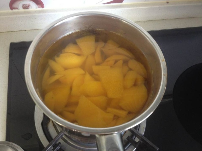 这周末好热好热啊!温度高达33度,一天宅家,空调开着,胃口还大减。我这个妈妈必须让孩子吃饱啊!冥思苦想那就做点可口的凉爽的甜食吧!正好妹妹带来很多的黄桃,看到很多的朋友做黄桃罐头,那咱也来点洋气的,麻利的做上,全家老幼皆喜欢的黄桃罐头。有图有真相!大赞! ![]() 干净的吸了六个桃子,好大好新鲜啊!今早刚采摘来的,绝对的新鲜! ![]() 去皮,黄黄的很有食欲吧!真的很好吃,不煮我也很喜欢吃啊,酸酸甜甜。哈喇子流出来了吧?嘻嘻 ![]() 削块,因为放小锅里,我就没煮很多!煮一顿吃一顿吧! ![]() 苍天啊大地啊,你咋做的家庭主妇啊,家里的冰糖没了,只有四小块,难道不做,不行既然开始了咱就继续凑合吧!冰糖没了咱来点白糖吧!亲们此处可以学啊! ![]() ![]() 其实放多少糖真没个数,大体约莫就行了,第一次做,放的有点多啊! ![]() 放入冷水,我喜欢放多点,喝点甜水啊 ![]() 开始煮上,大约煮了七八分钟开锅了,继续开盖再煮5分钟,看着熟了就行了,我也是约莫着啊! ![]() ![]() 我的黄桃熟了,看着鲜艳欲滴,很有感觉啊!实物更有食欲啊! ![]() ![]() 开吃了,真是超级美味,酸酸甜甜,宝宝吃了两碗,姐姐吃了两碗,我们只能吃点剩余,如果放冰箱冰一会会更美味啊!我们都来不及冰镇全部下肚,好吃看的见的黄桃罐头来了,亲们一起做吧,简单易学,有营养啊! 黄桃的营养十分丰富,根据农科院专家检测:它的主要营养成份有:丰富的维生素C和大量的人体所需要的纤维素、胡萝卜素、番茄黄素、红素及多种微量元素。如硒、锌等含量均明显高于其它普通桃子,还含有苹果酸、柠檬酸等成分。具有养阴、生津、润燥活血的功效;主治夏日口渴,便秘,痛经,虚劳喘咳,疝气疼痛,遗精,自汗,盗汗等症。 黄桃的皮与果均显金黄色,甜多酸少,味道独特,每天吃二只可以起到通便、降血糖、血脂,抗自由基,祛除黑斑、延缓衰老、提高免疫功能等作用,也能促进食欲,堪称保健水果、养生之桃. 本作品未经作者许可不得转载,转载请征求作者意见。擅自转载使用,将保留追究其法律责任的权利! |